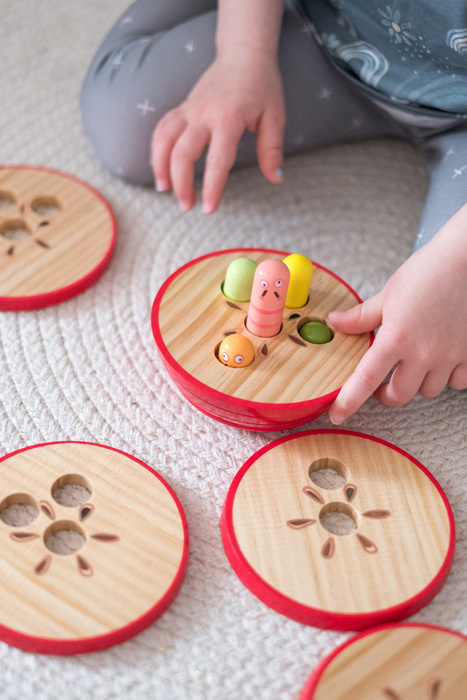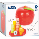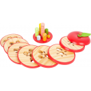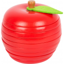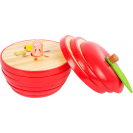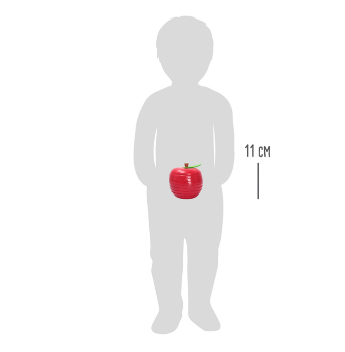 Dřevěná, 9 dílná skládačka jablka zdobeného plstěným lístkem, v jasných barvách. Procvičujte jemnou motoriku, koordinaci zraku a rukou i prostorovou představivost, aniž byste ubírali na zábavě. Každý červík vykukující ze základního dílu má jinou výšku, skládejte jablko po vrstvách tak, aby počet děr ve vrstvě odpovídal počtu právě vykukujících červíků. Sestavené jablko je ozdobou každé police.