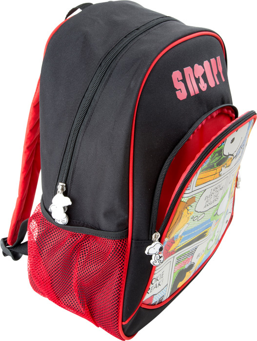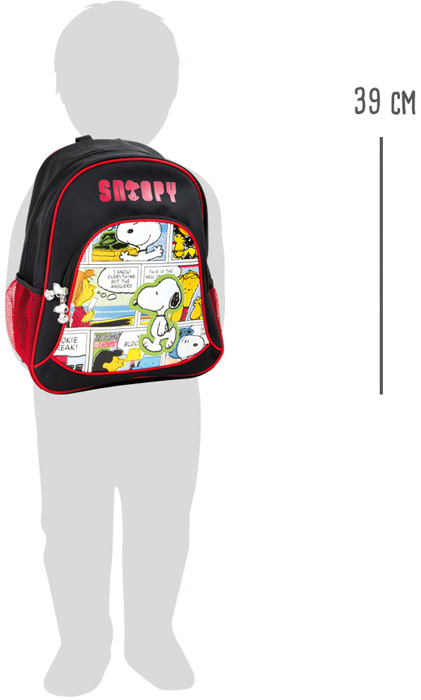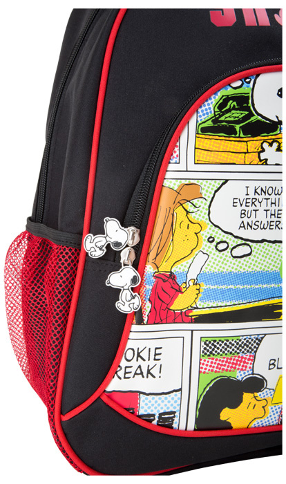 Díky Snoopy & Co. je tento batoh perfektním společníkem do školy. Velká i malá kapsa se zapíná na zip. Navíc dvě malé síťové kapsy po stranách lze využít pro uložení lahví. Další kapsa poskytuje prostor pro ještě více věcí. Popruhy jsou polstrované, lze je upravit i na délku. Díky svým komiksovým obrázkům je batoh pro děti opravdovým poutačem.