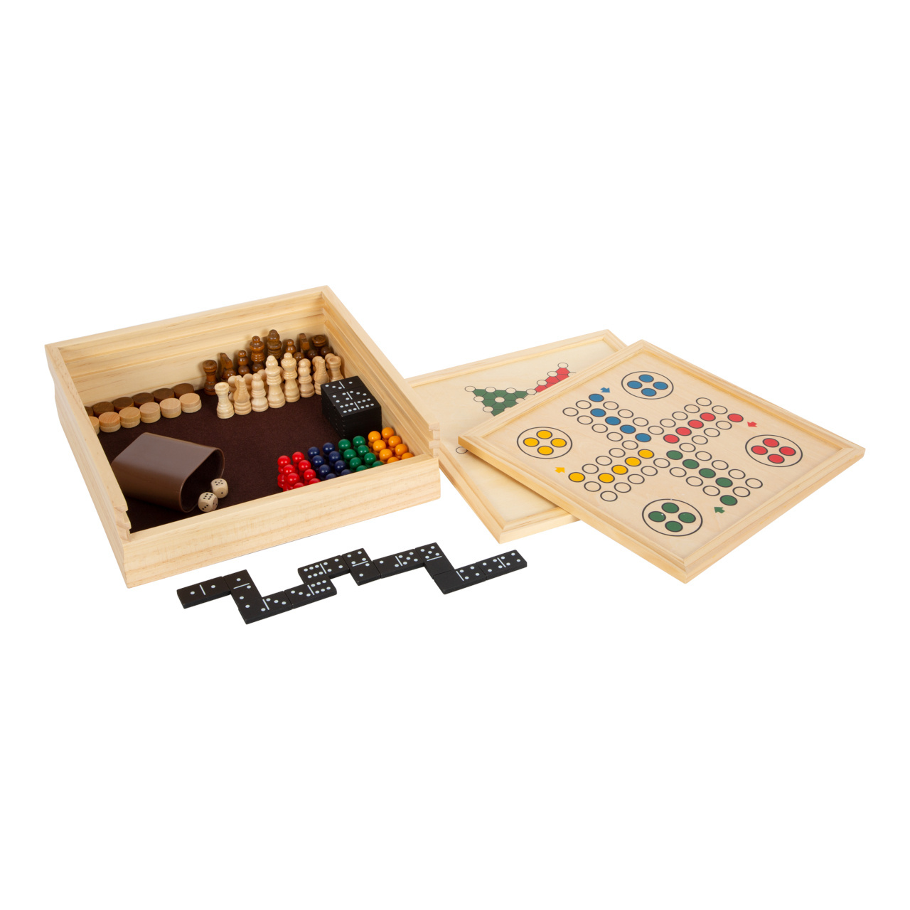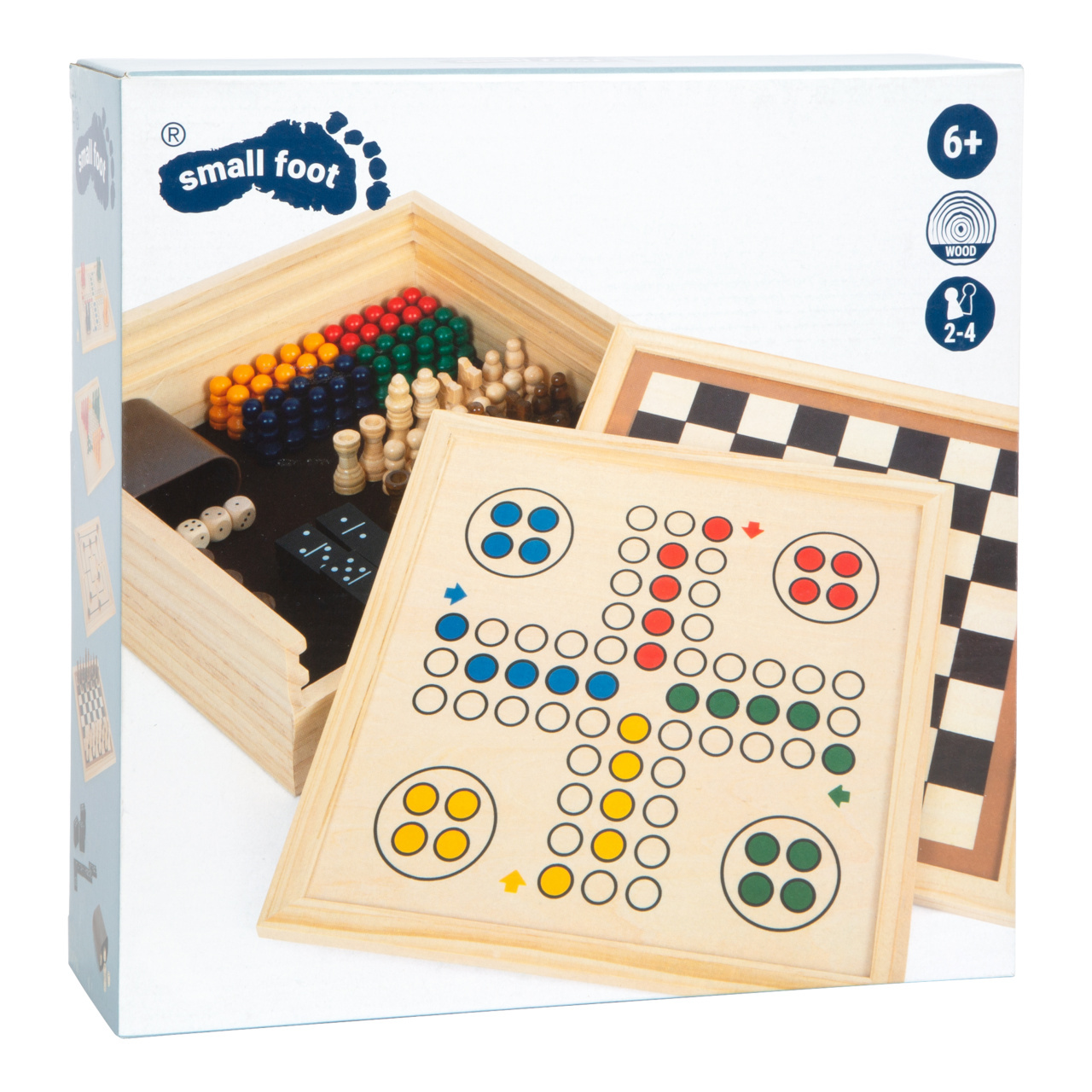 Soubor her pro celou rodinu se všemi důležitými klasickými hrami a oblíbenými společenskými hrami. Ať už domino, ludo, šachy, dáma, mlýn, Halma & Co. Tato kolekce her s hracími deskami vyrobenými z robustního dřeva obsahuje vše, co děti i rodiče potřebují pro zábavné herní odpoledne. V pevné dřevěné krabici s plstěným dnem se nic neztratí.
