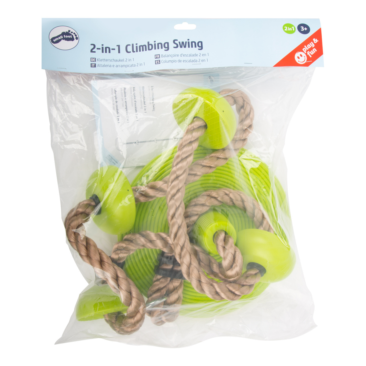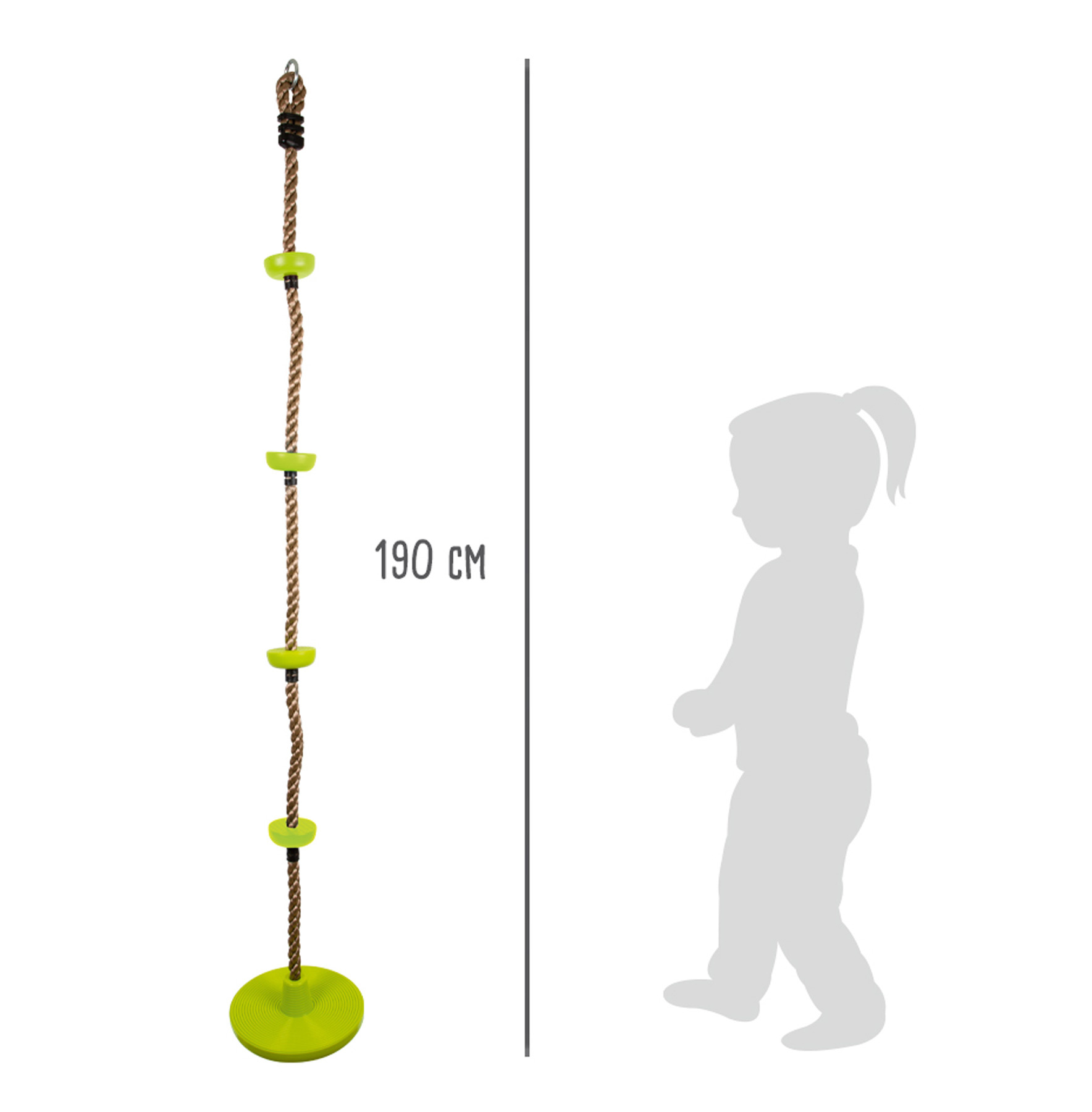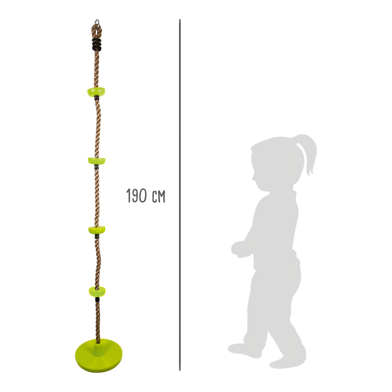 Toto multifunkční šplhací lano je vybaveno nášlapnými body, které jsou vyrobeny z robustního plastu. Čtyři pestře zelené body a úplně dole větší disk, na kterém se děti mohou houpat. Nášlapné body a disk mají žebrování, aby bylo hraní bezpečnější. V balení také oko, za které můžete lano zavěsit. Šplh trénuje ovládání těla, rovnováhu a sílu. Zábava domů i na zahradu.