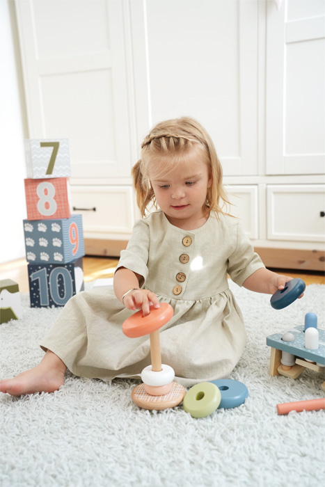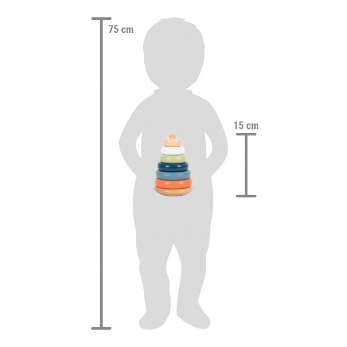 Zábava při nasazování s arktickou atmosférou. Tato nasazovací věž z certifikovaného dřeva FSC® motivuje i ty nejmenší děti, aby třídily šest různě barevných kroužků podle velikosti a skládaly je na sebe. Tato aktivita trénuje motorické dovednosti, koordinaci ruka-oko a poskytuje pochopení barev a velikostí. Zaoblená základna umožňuje, aby se nasazovací věž kývala tam a zpět, což zábavným způsobem zpochybňuje dětskou zručnost. Pohyblivý kolík zvyšuje bezpečnost.