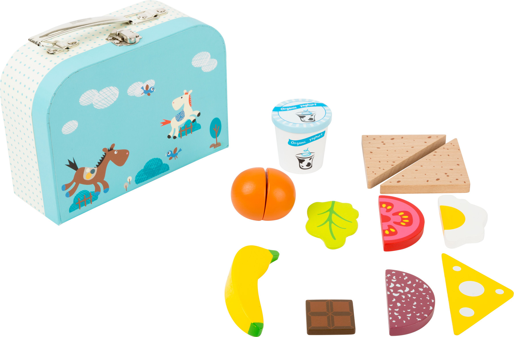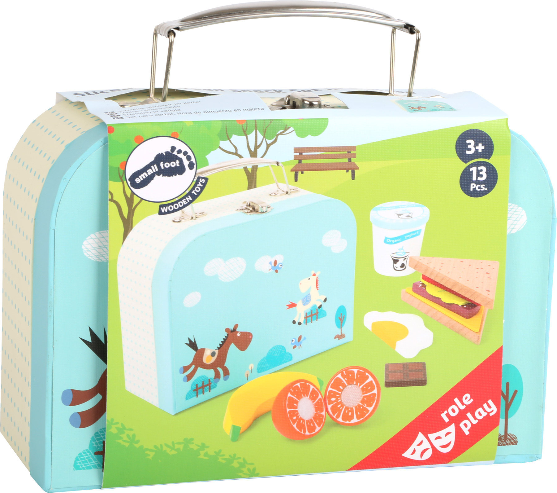 Rozměry kufříku: 19x1,5x15 cm Rozměr jogurtu: 5,5 cm, Ø 5,5 cm Věk: 3+ Materiál: dřevo Small Foot Svačinkový kufřík modrý