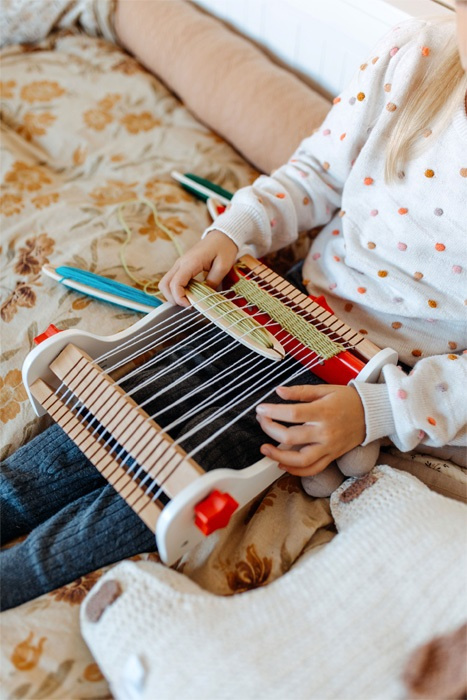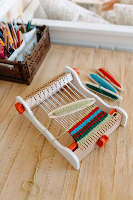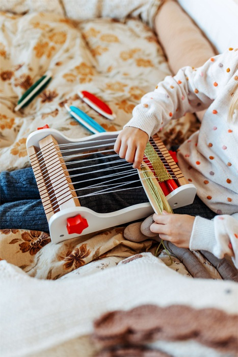 Pozor všechny kreativní děti! Tento dřevěný tkací rám je zvláště vhodný pro první umělecké výtvory dítěte. Tato sada obsahuje základní nitě a čtyři malé tkací špulky s navinutými různě zbarvenými vlněnými přízemi. Extra velký a hladce se ovládající napínací knoflík je ideální pro dětské ruce. Kreativní práce může začít okamžitě s obzvláště snadnou obsluhou tohoto prvního tkacího rámu. Je to skvělá zábava s tkaním, která podporuje rozvoj kreativity a fantazie.