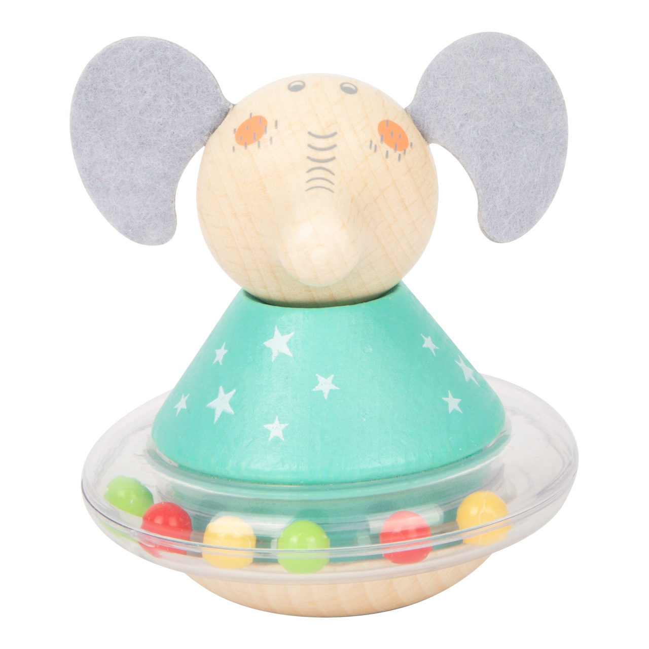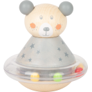 Zvířátko, postav se! Když do roztomilých dřevěných zvířátek strčíte, začnou se houpat dopředu a dozadu, zároveň se perličky kolem jejich pasu začnou pohybovat a vydávat pěkný zvuk. Plastový kroužek s perličkami je otočný, hlava zvířat je připevněna gumičkou. Medvěd, králík a slon jsou zároveň hmatací hračkou i chrastítkem.
