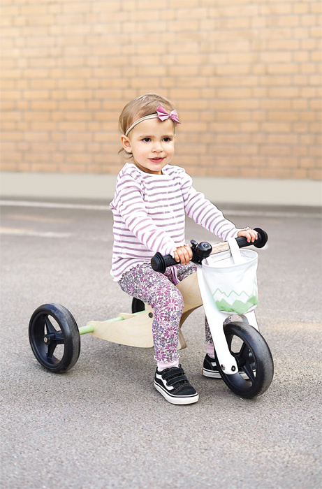 Nejprve tréninková tříkolka, pak balanční kolo! Tato kompaktní vyvážená tříkolka zaujme svými četnými funkcemi a svěžím, moderním designem. Začínající jezdci mohou začít s tímto bezpečným tříkolovým modelem. Výšku sedla lze nastavit do 3 úrovní a vzdálenost sedáku lze nastavit do 3 poloh. Jakmile se zlepší jízdní schopnosti a rovnováha Vašeho dítěte, lze tříkolku rychle přeměnit na klasické balanční kolo. Pro maximální bezpečnost mají řídítka omezovač poloměru otáčení. Zvonek, odnímatelná brašna na řídítka, gumové rukojeti, nezničitelné měkké pneumatiky EVA a polstrované sedlo, to vše poskytuje spoustu zábavy a pohodlí při jízdě! Balanční kola a tříkolky trénují motoriku, rovnováhu a koordinaci lépe než jakékoli jiné dětské vozidlo - a dělají to jedinečně!