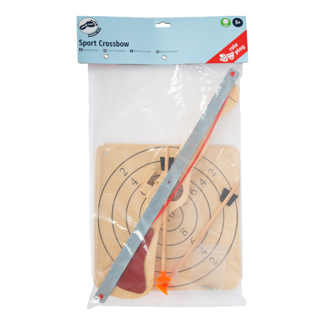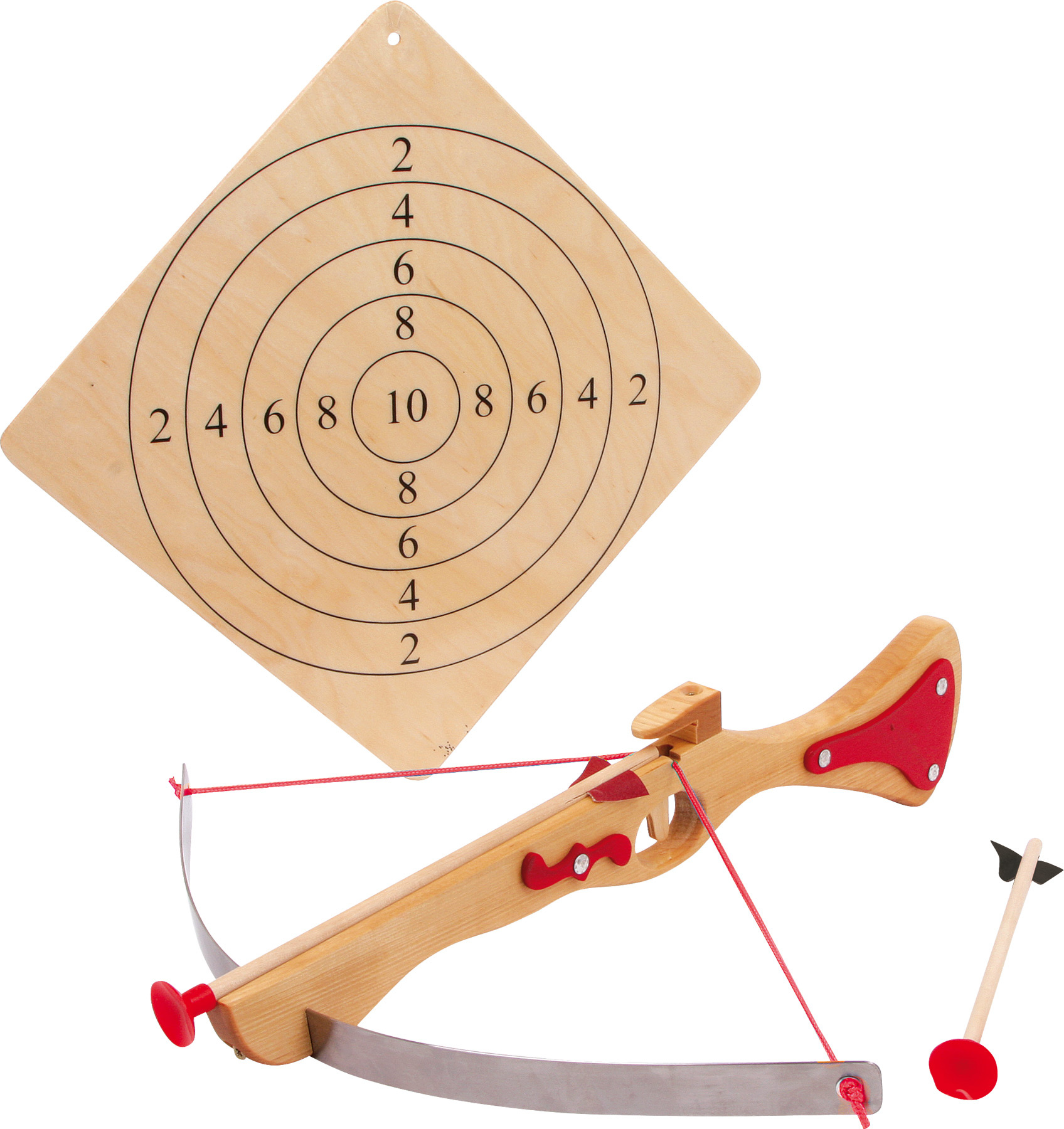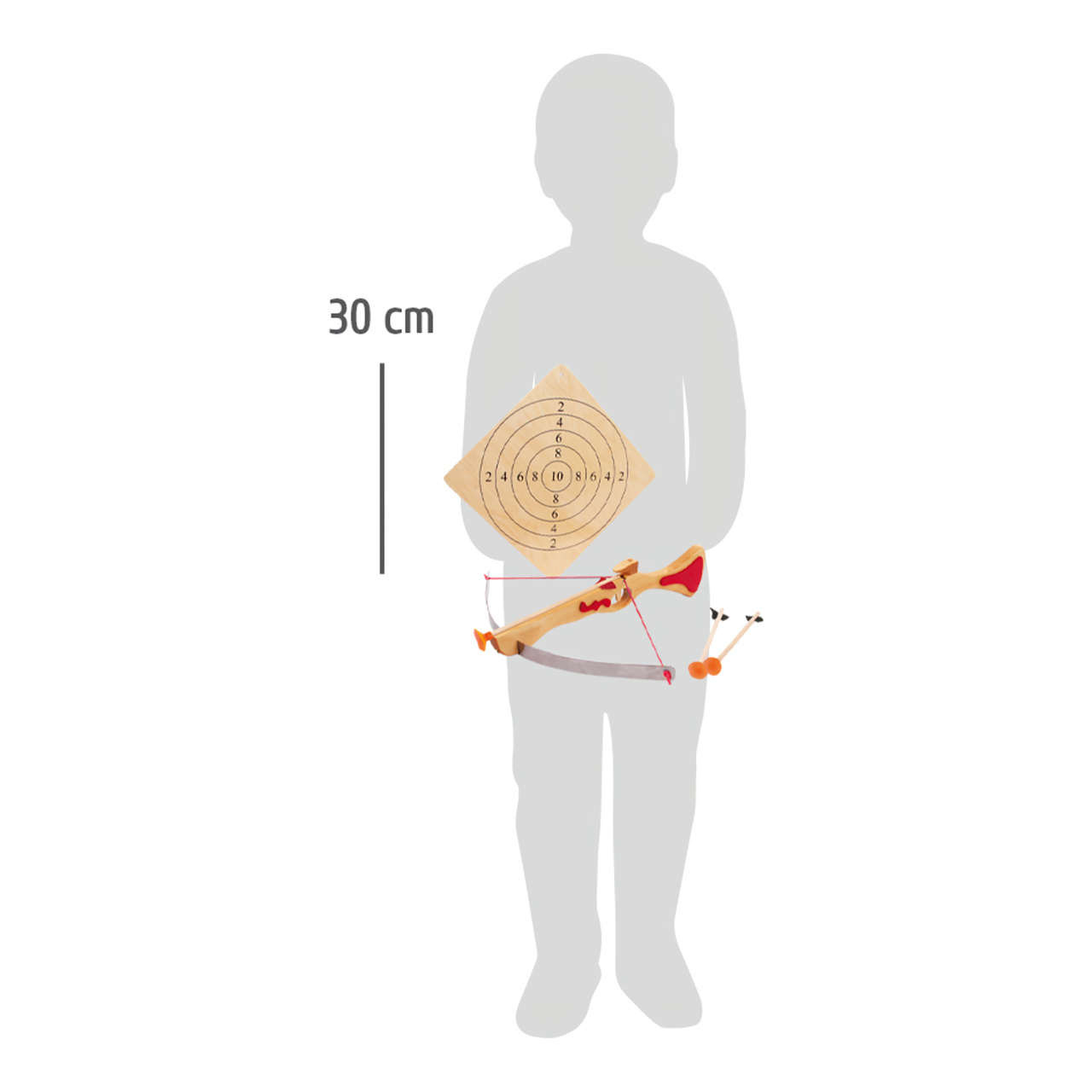 S touto kuší mohou děti prokázat svou přesnost. Střelecká zábava může probíhat bez váhání, protože dřevěná sportovní kuše střílí pouze dřevěné šípy s přísavkami. Vysoce kvalitní gumové krytky umožňují, aby se šipky lepily na hladký povrch.