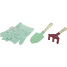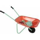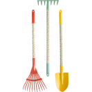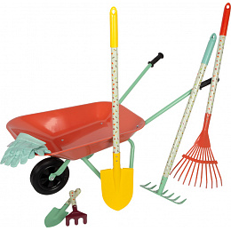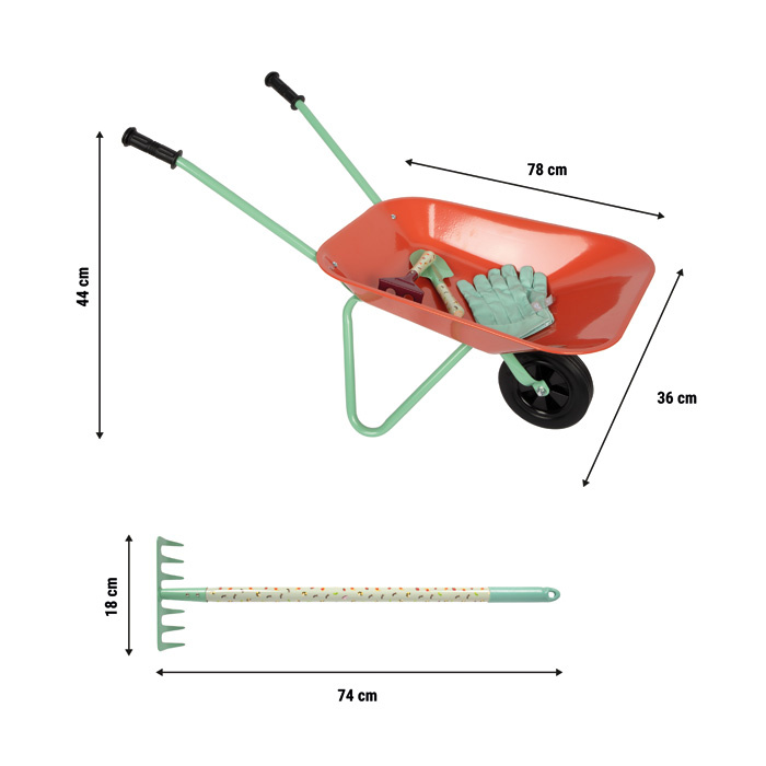 Tato velká zahradní sada s kolečky nabízí vše potřebné pro malé zahradníky. Obsahuje zahradní kolečko, tři velké nástroje (hrábě, rýč a motyku), dva menší ruční nástroje (lopatku a ruční hrábě) a odolné dětské zahradní rukavice. Děti tak mají ideální vybavení pro kreativní práci na zahradě, pískovišti i na pláži. Stabilní kolečko s pevnými koly se snadno ovládá a umožňuje pohodlně převážet zeminu, písek i malé zahradní poklady. Velké i malé nástroje jsou přizpůsobené dětským rukám, takže kopání, hrabání, sázení nebo stavění na pískovišti je snadné a zábavné. Veselé motivy zvířátek navíc dodávají celé sadě hravý vzhled. Velkou výhodou jsou také odolné pracovní rukavice v dětské velikosti, které chrání malé ruce při práci. Moderní barevné provedení dělá ze sady atraktivní doplněk pro každé venkovní dobrodružství. Ať už na zahradě, na pískovišti nebo u vody, zahradní sada s trakařem přináší dětem radost z pohybu a podporuje jejich vztah k přírodě hravou formou.