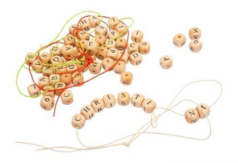 300 ks dřevěných hracích kostek lze snadno navléknout na čtyři barevné provázky, které jsou součástí balení. Můžete tak rychle vytvořit skvělé řetězce jmen a dalších slovních spojení. Nebo jen tak na stole skládat slova. Hravým způsobem se dítě naučí poznat písmena a povzbudí ho k prvním pokusům „psát“.
