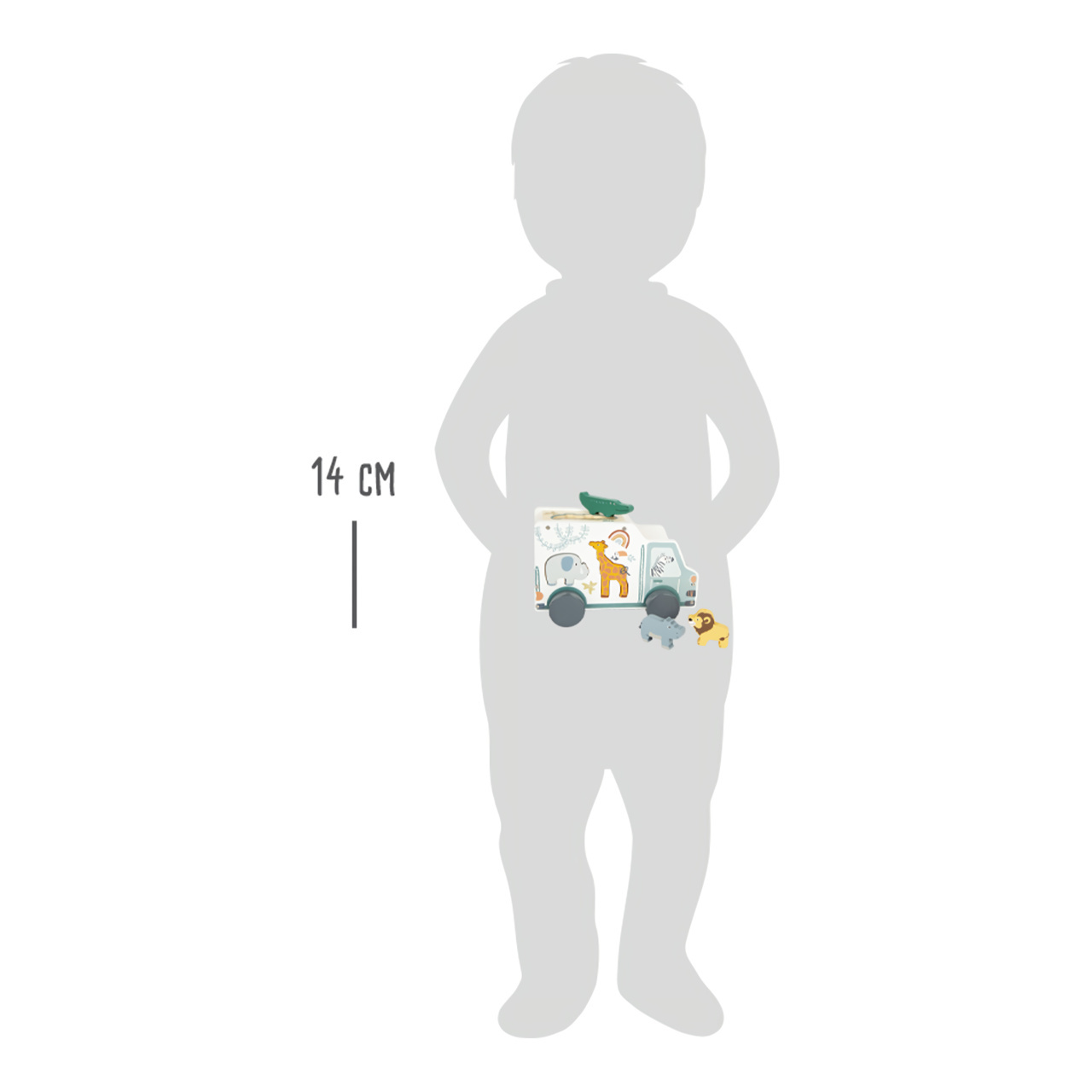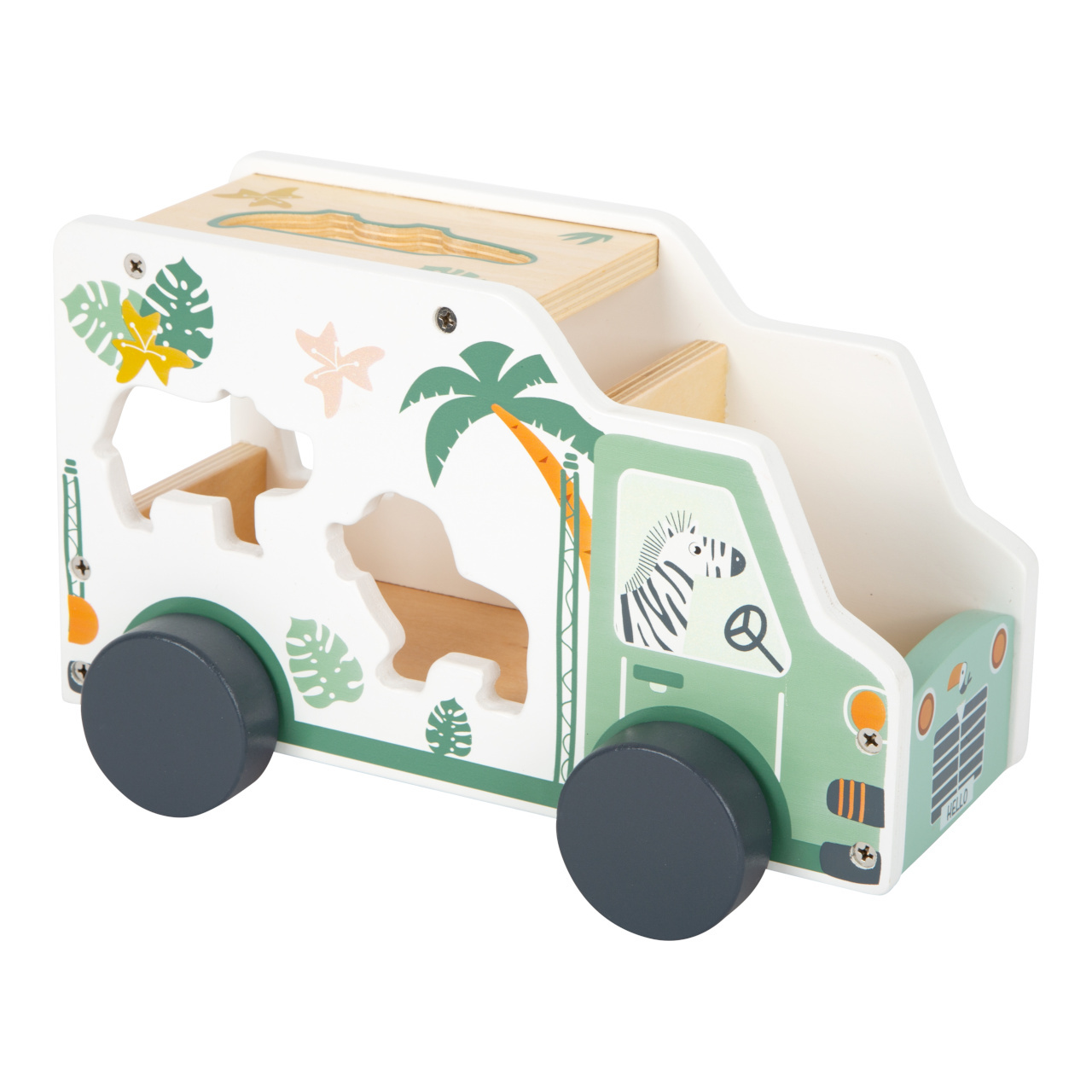 Vkládací hračka a dřevěné autíčko v jednom. Dřevěná vkládačka v populárním safari designu. Žirafa, hroch, lev a jejich kamarádi jsou připraveni na výlet do divočiny se zebrou řidičkou. Safari minibus má pět vkládacích otvorů, pro každé zvíře jeden. Krásná hračka, která trénuje rozpoznávání tvarů a motoriku. Auto má mnoho detailů a dost místa pro roztomilé figurky. Dlouhotrvající zábava v každém dětském pokojíku!