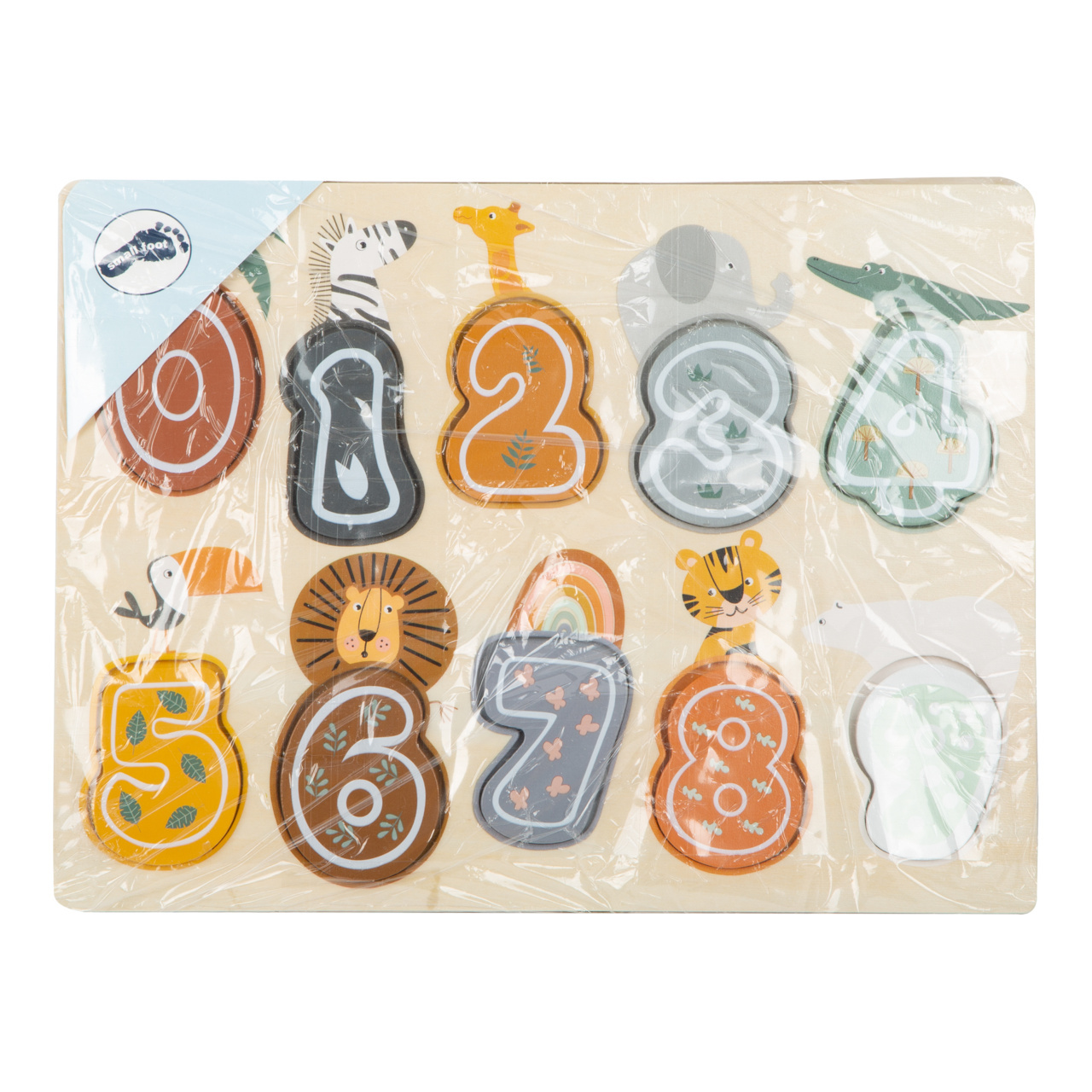 Naučte se čísla jednoduchým způsobem! Děti se mohou naučit čísla od 0 do 9 a zároveň si procvičit jemnou motoriku. Dřevěné edukativní puzzle s ilustrací zebry, žirafy, slona, lva a dalších. Deset vystouplých dřevěných číslic lze jednoduše uchopit a vložit do správných otvorů i malýma rukama. V otvorech děti uvidí také jméno každé z číslic v anglickém jazyce. Mohou si tak zároveň procvičit angličtinu. Kdo dokáže napočítat do 10 bez pomoci rodičů? Z číslic můžete také skládat vyšší čísla.