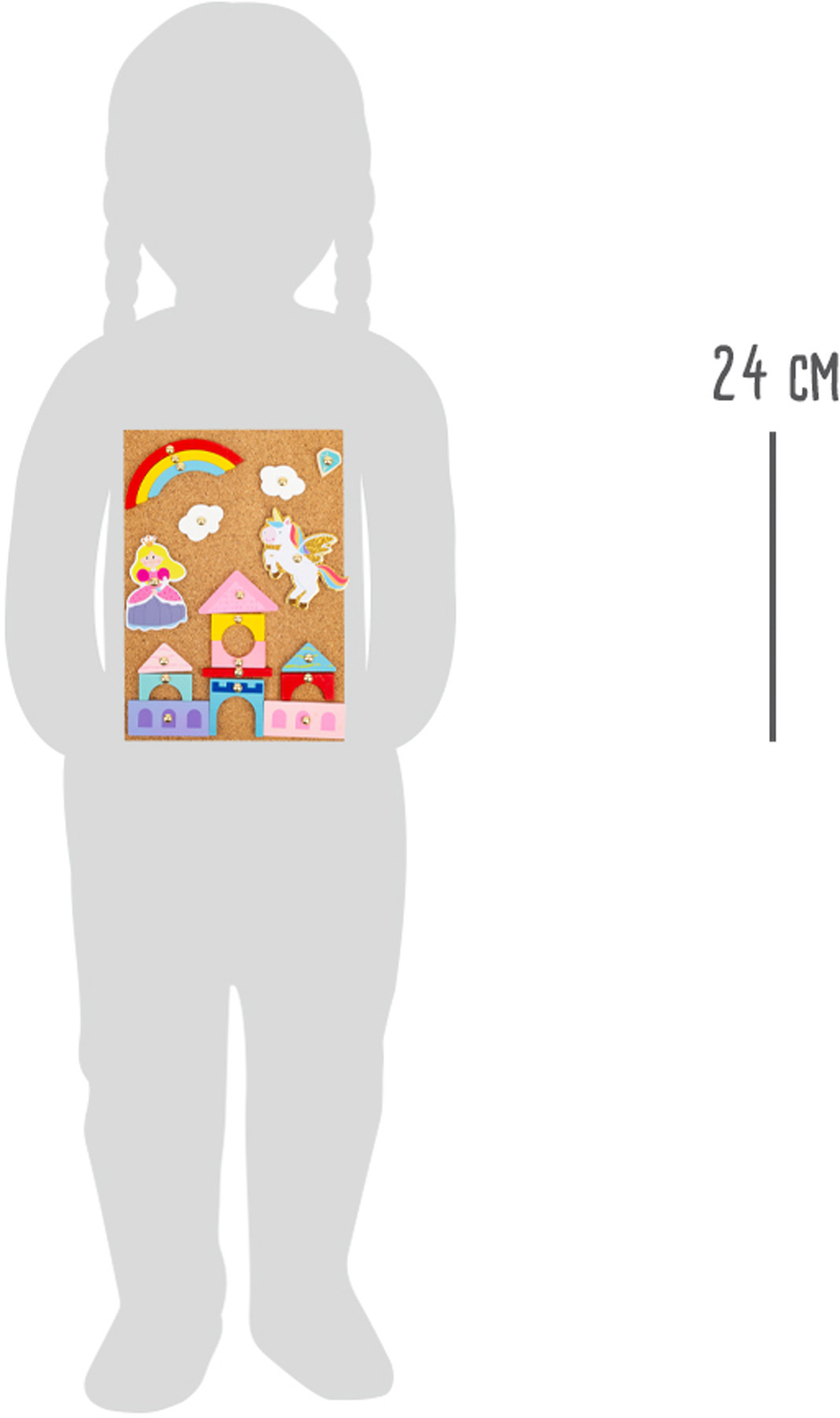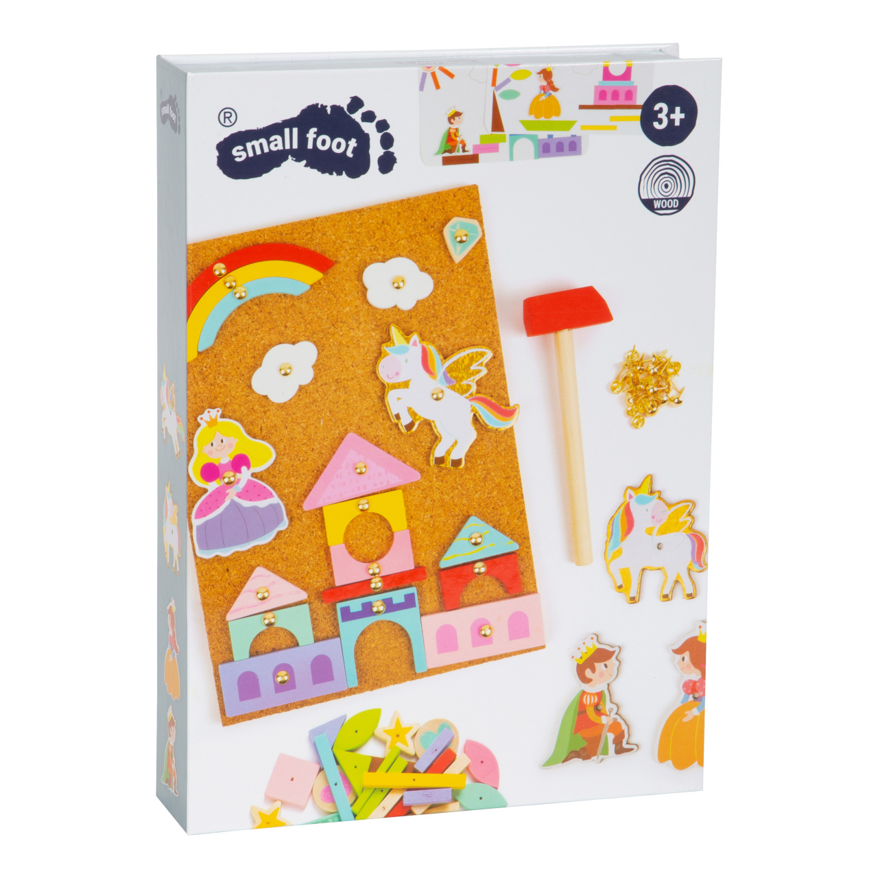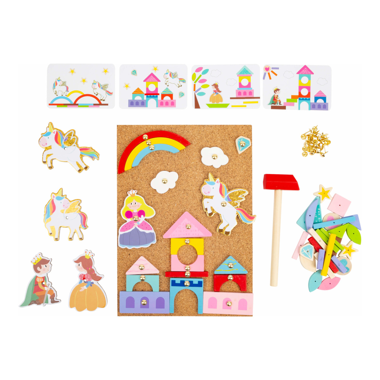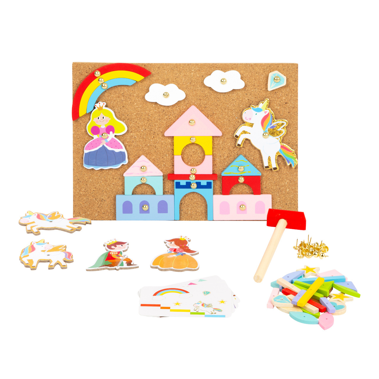 Magická zábava s kladivem a připínáčky. V balení najdete korkovou desku, kladivo, připínáčky a dřevěné objekty různých tvarů. Děti si mohou na desce/nástěnce díky zatlkoukačce vytvořit různé obrázky. Ať je to princezna, pohádkový hrad nebo jednorožec, obsauje tato sada vše k vytvoření kouzelného obrazu. V balení najdete také obrázkové předlohy, z kterých se děti mohou inspirovat. Tato hra podporuje rozvoj kreativity a dá dětem vlastní prostor pro tvoření. Vše je zabaleno v praktickém boxu a tak se vám nic ze sady neztratí!