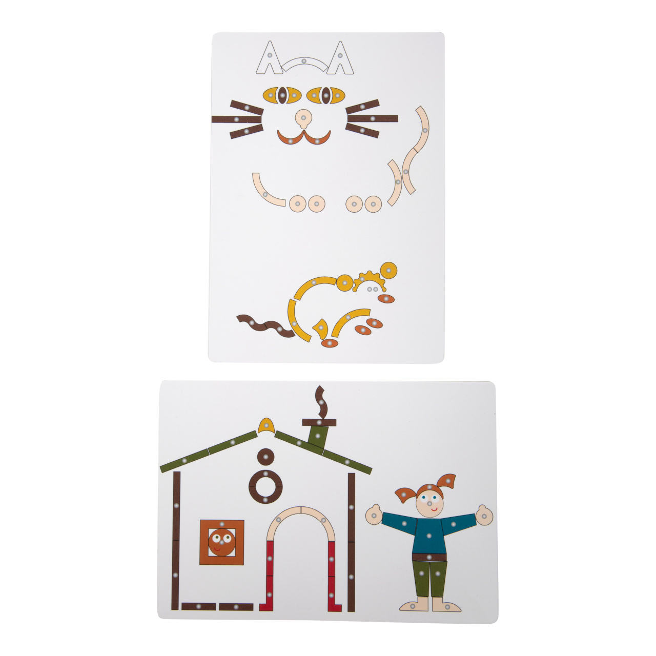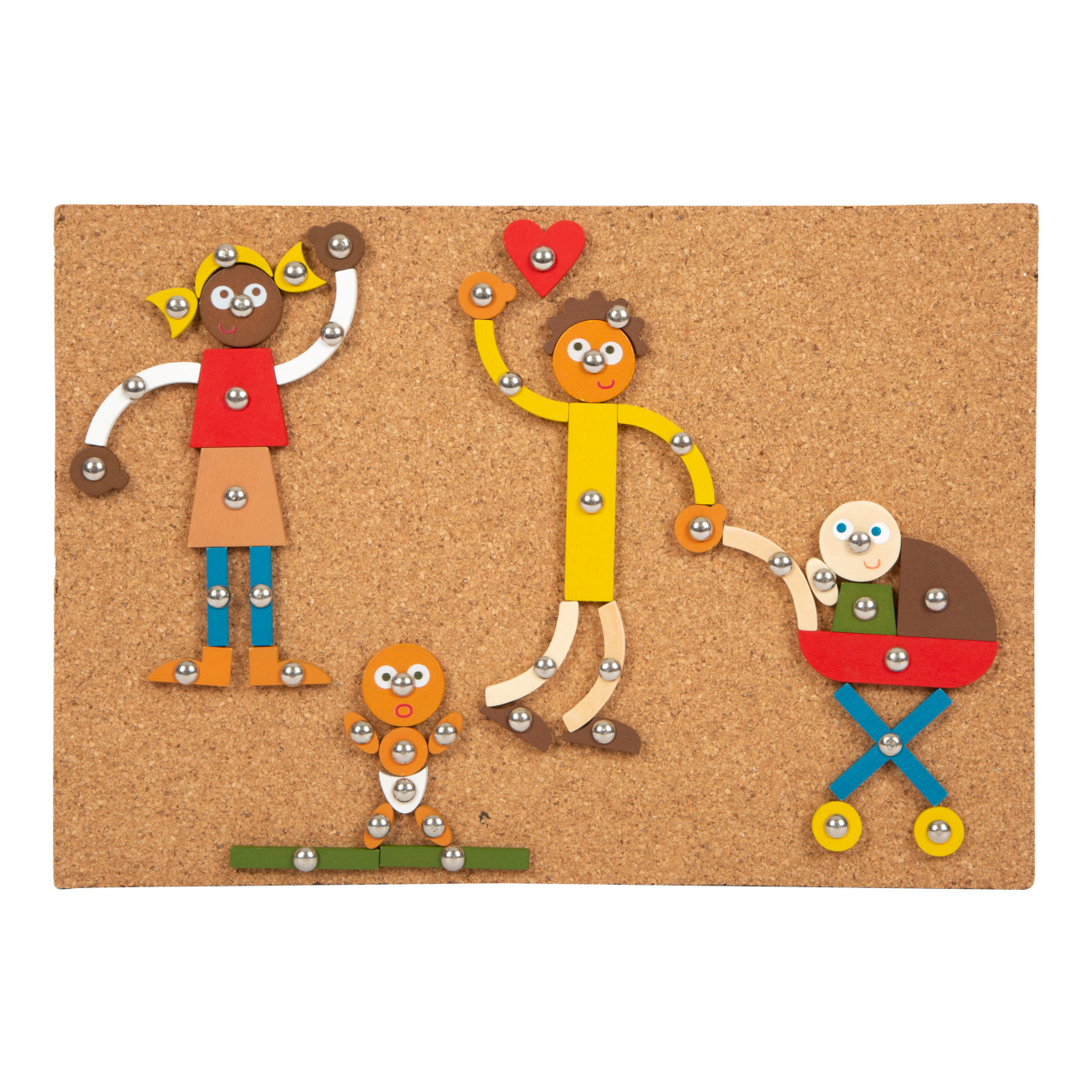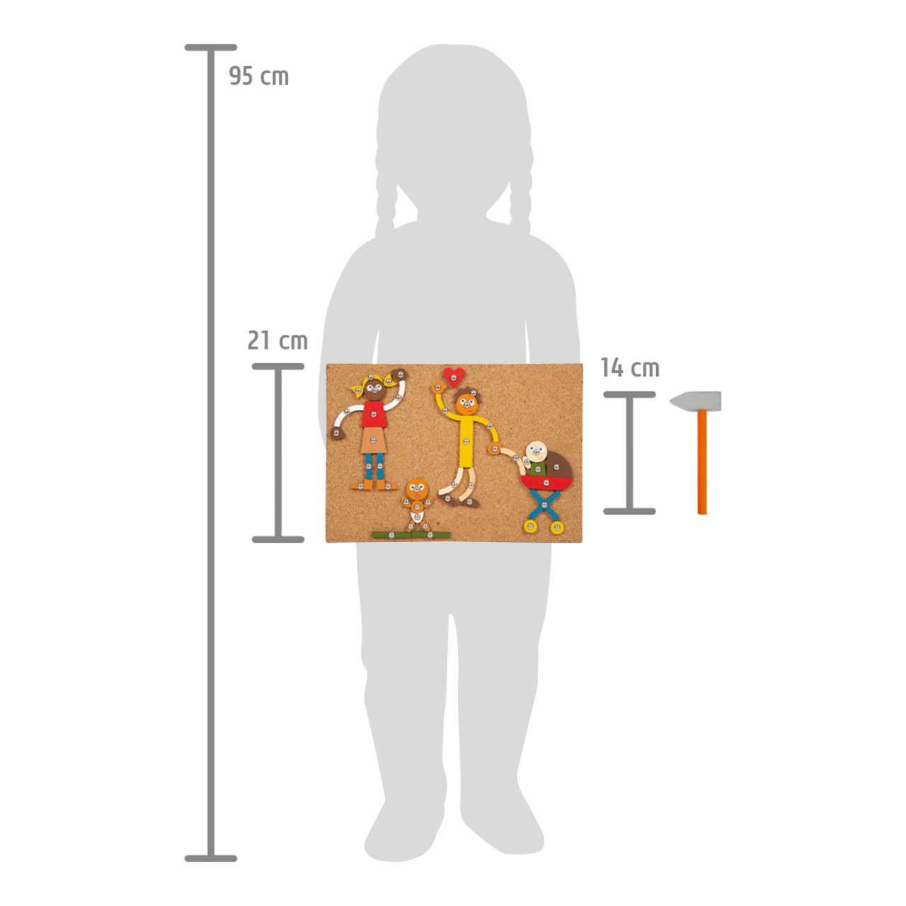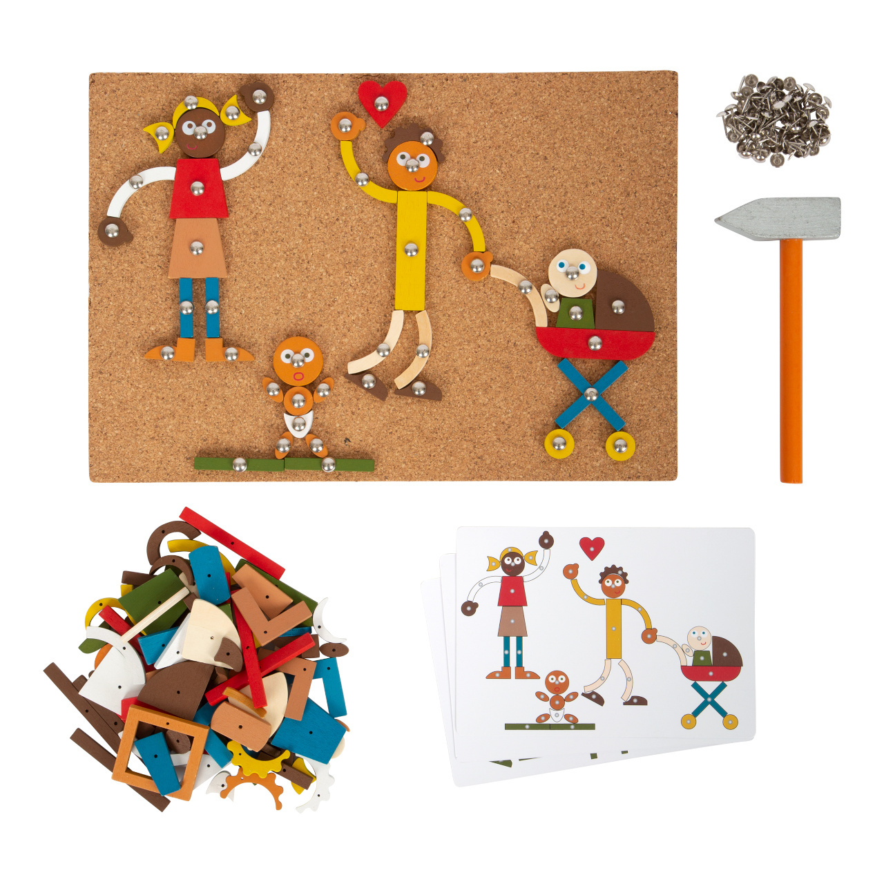 Obsáhlá kreativní hrací sada s tematikou rodiny! V balení najdete korkovou podložku, dřevěné kladivo, připínáčky a mnoho dílků z laminovaného dřeva v rozdílných tvarech a barvách. V krabici, která je vhodná i na uschování této hračky, najdete šest obrázkových předloh.