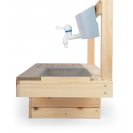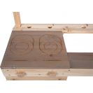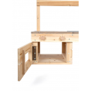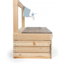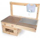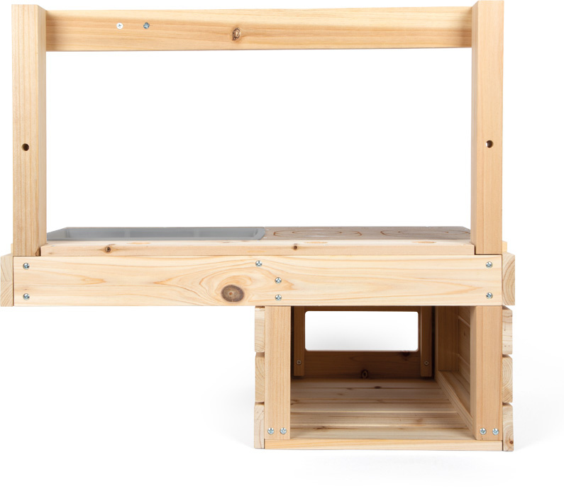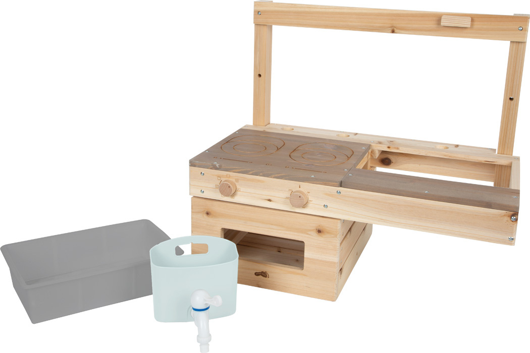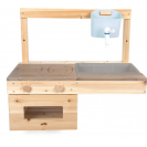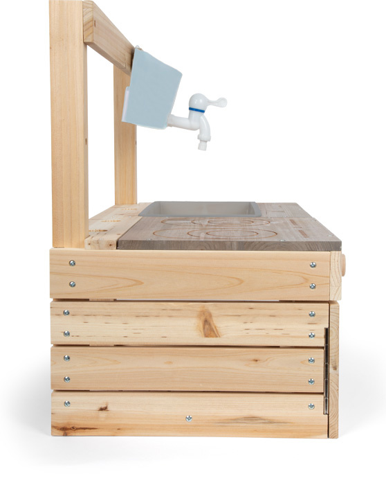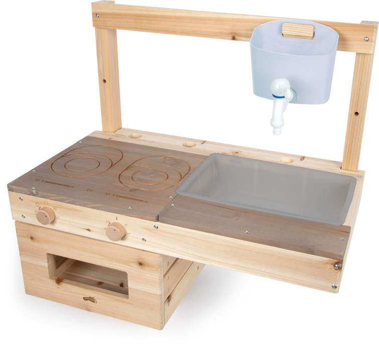 Chytré řešení pro kreativní kulinářské zážitky i v těch nejmenších prostorech! Tato prostorově úsporná venkovní kuchyňka je díky své kompaktní konstrukci ideální volbou pro menší zahrady, terasy nebo dětská hřiště. Můžete ji snadno zavěsit na herní sestavu, zahradní domek nebo jakoukoli stěnu a vytvořit tak dětem stylový herní kout. Kuchyňka je vybavena varnou deskou s gravírovanými zónami a dotykovým ovládáním, praktickou troubou se dvěma otočnými knoflíky a nechybí ani závěsný zásobník na vodu s funkčním kohoutkem a dřezem. Pracovní plocha je pro vyšší odolnost ošetřena nátěrem v kontrastní barvě, který podtrhuje moderní vzhled hračky. Díky praktickým výřezům v desce mají malí kuchaři své vařečky, klacíky a další nezbytné náčiní neustále při ruce. Tato robustní konstrukce umožňuje dětem naplno rozvinout fantazii při vaření z bláta a vody, aniž by zabírala místo na zemi. Lakovaný povrch pracovní desky poskytuje elegantní kontrast k přírodnímu dřevu a dodává celku šmrnc. Aby vám kuchyňka dělala radost co nejdéle, doporučujeme neošetřené dřevěné části ošetřit vhodnou impregnací.