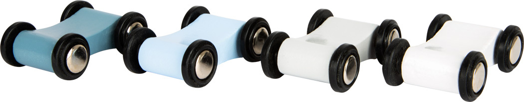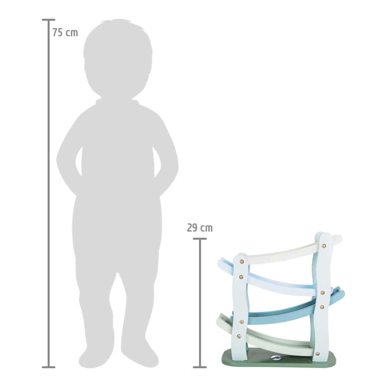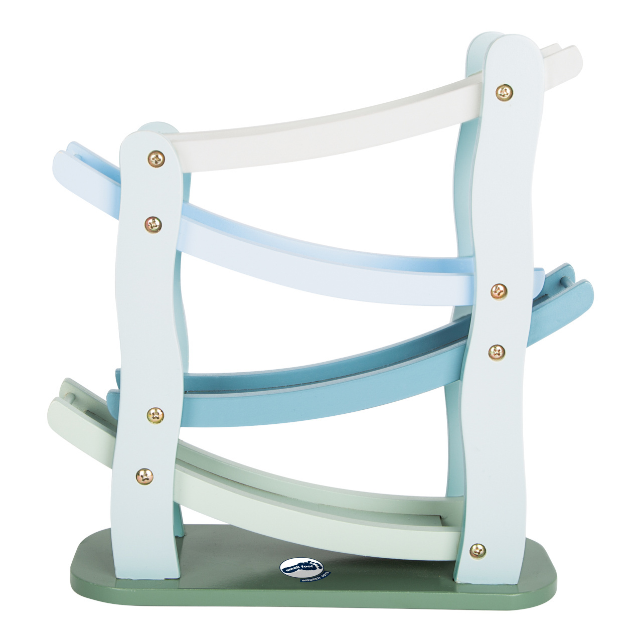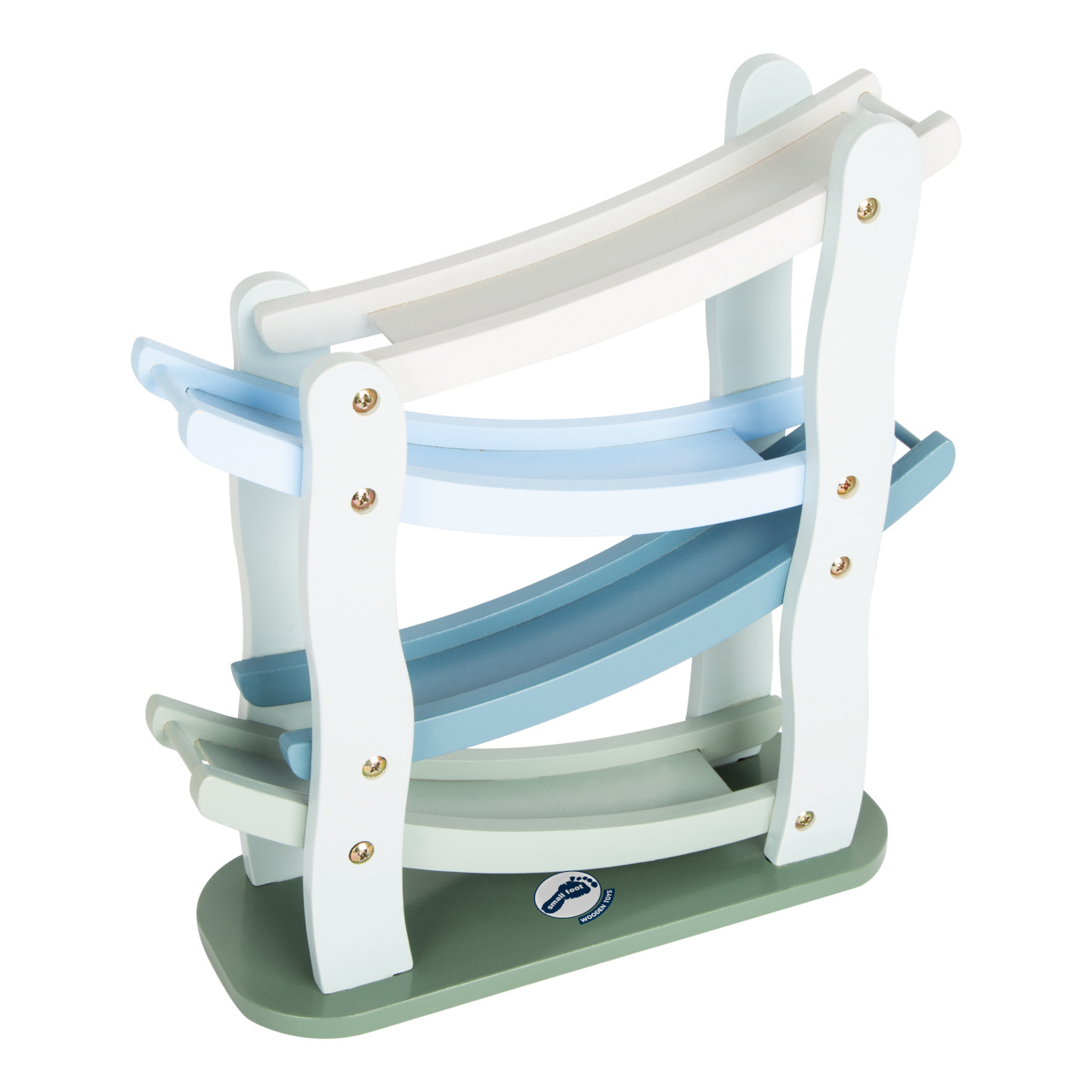 Na značky, připravit, start! Tato dřevěná kaskádová závodní dráha nabízí prostor pro změření rychlosti 4 autíček. Z jednoho patra na druhé, autíčka dělají přemety a jen koukat na ně je zábavné. Dráha je vyrobena z přírodního a bílého dřeva, jedno autíčko je přírodní, zbylé 3 jsou barevné. Hračka rozvíjí motoriku dětí, také koordinaci ruka-oko.