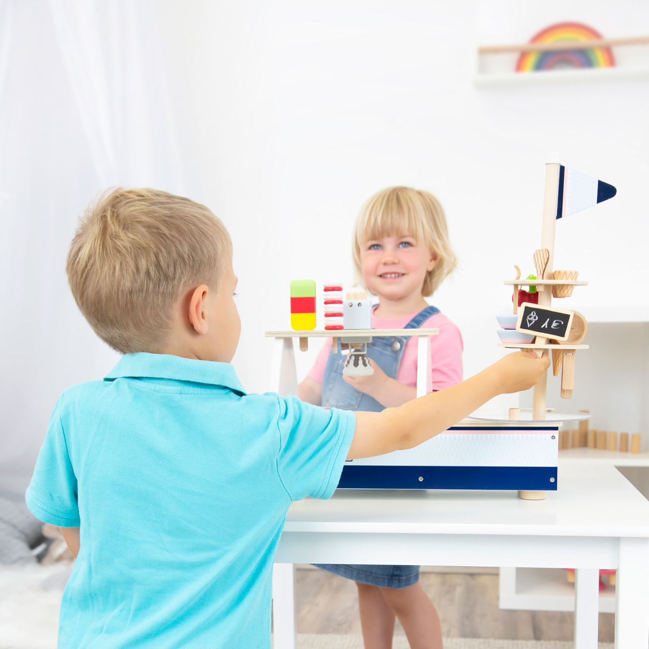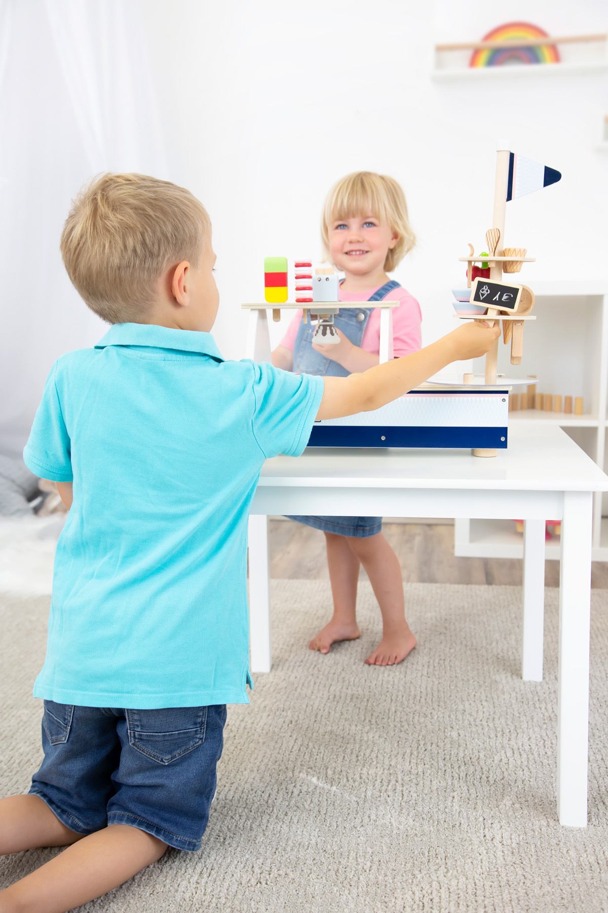Jdeme na zmrzlinu! Tento dřevěný zmrzlinový set je perfektní na léto i zimu. Zmrzlinový stánek je modro-růžový, má také prvky přírodního dřeva, zákazníky nadchne velkým výběrem dezertů a svými funkcemi a příslušenstvím. Můžete si dát více kopečků zmrzliny, nanuk, točenou zmrzlinu, poháry, wafle... a to vše ozdobit třešničkou. Stánek má také plastovou vitrínu, mrazničku s plastovým poklopem, stojan na kornouty. Kopečky zmrzliny a točená zmrzlina jsou magnetické, v balení také najdete tabulku, na kterou můžete psát křídou. Zmrzlinu (vanilku, čokoládu, stracciatellu a jahodu) můžete z vitríny vyndat a dát ji do misky nebo kornoutu. Všechny se také vejdou na wafli. Vytvořte si dezert dle svého gusta. Zmrzlinový stánek má také úložný prostor.