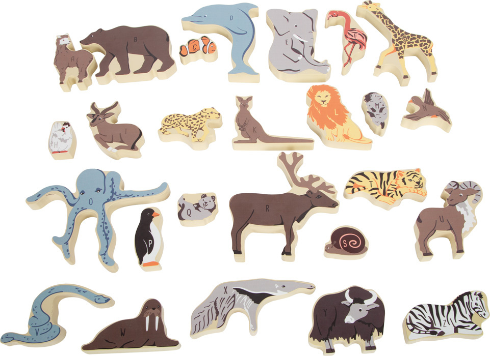 Skládat puzzle a přitom se učit abecedu. Sada obsahuje 26ks barevného písmenkového puzzle zvířat. Alpaka, plameňák, tučňák a spol. jsou vyrobeny ze dřeva. Jsou pro děti snadno uchopitelné a lze je používat i samostatně. Zvířátka jsou označena prvními písmeny svých německých a anglických jmen, která pomáhají zjistit správné uspořádání dílků skládačky. Zvířecí puzzle je zábava, která hravě podporuje učení písmen a jmen zvířat. Puzzle zvířátka nabízí nejen možnost hravou formou poznávat zvířátka a písmenka, ale také trénuje jemnou motoriku, koncentraci a trpělivost. Ideální pro (před)školní děti.