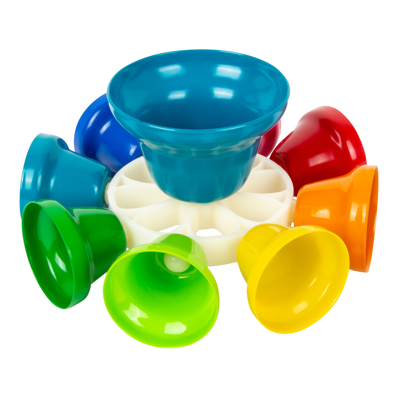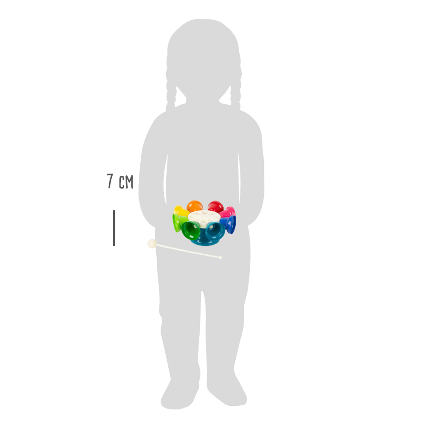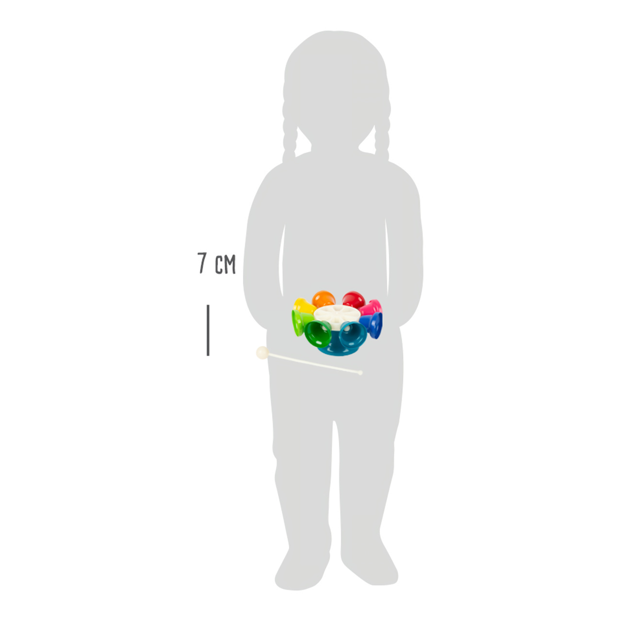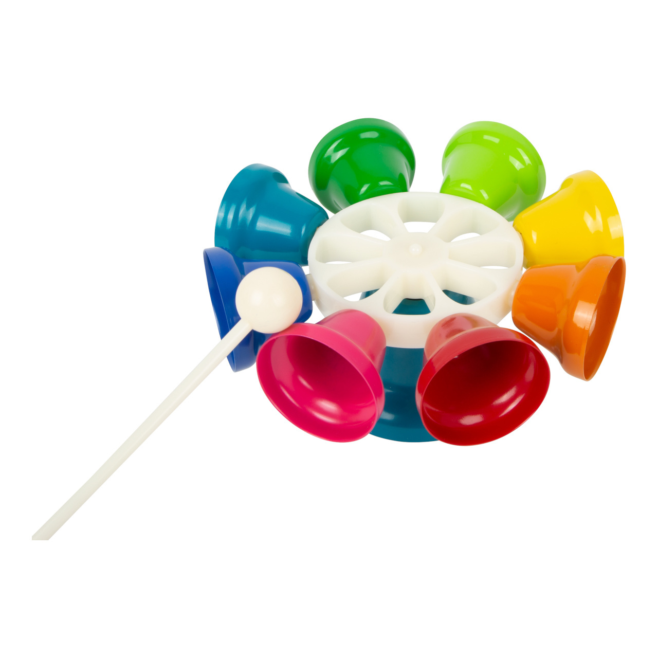 Jiná barva, jiný zvuk! Tento kolotoč má osm barevných zvonečků, každý z nich je naladěn na jinou notu – C, D, E, F, G, A, H, C. Zvoneček můžete držet v ruce nebo jej nechat na stojanu. Paličkou můžete hrát podobně jako na xylofon. V balení naleznete také noty s 8 různými skladbami pro začátečníky a malé děti – noty jsou zaznačeny i barevně. Hudební set podporuje u dětí rozvoj rytmu, hudebního sluchu a také koordinace ruka-oko. V notách najdete písničky jako „Strýček Donald farmu měl“, „Rolničky“, „Třpyť se, hvězdičko“. Perfektní také do školek, prvních stupňů základních škol.