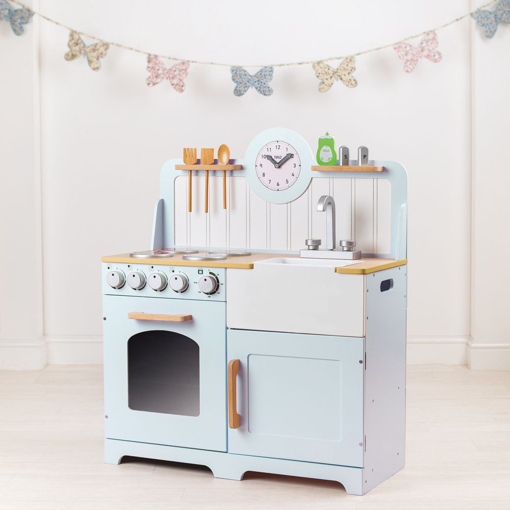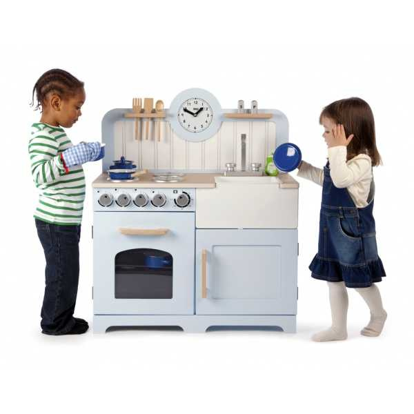 Mladí nastávající kuchaři si užijí vaření a pečení s touto dřevěnou kuchyní! Je vybavena čtyřmi varnými deskami, které jsou ovládány otočnými ciferníky, které vydávají klapavý zvuk. Obsahuje také troubu s policí a průzor, aby mladí kuchaři mohli jídlo kontrolovat. Dále úložnou skříňku, dřez, nádobí, které se dá zavěsit (viz obrázek), sůl a pepř a nakonec hodiny s otočnými ručičkami. Kuchyňka má vyšší desku a tak rostoucím dětem vydrží více let. Na boku má rukojeti k lehčímu uchopení. Skvělý způsob jak děti naučit bezpečnosti v kuchyni a zdravé stravě. Podporuje kreativní a představivou hru. Rozvíjí koordinaci ruka-oko a zručnost. Po vybalení je nutno složit. Vyrobeno z kvalitních materiálů z odpovědných zdrojů. Odpovídá evropské bezpečnostní normě.