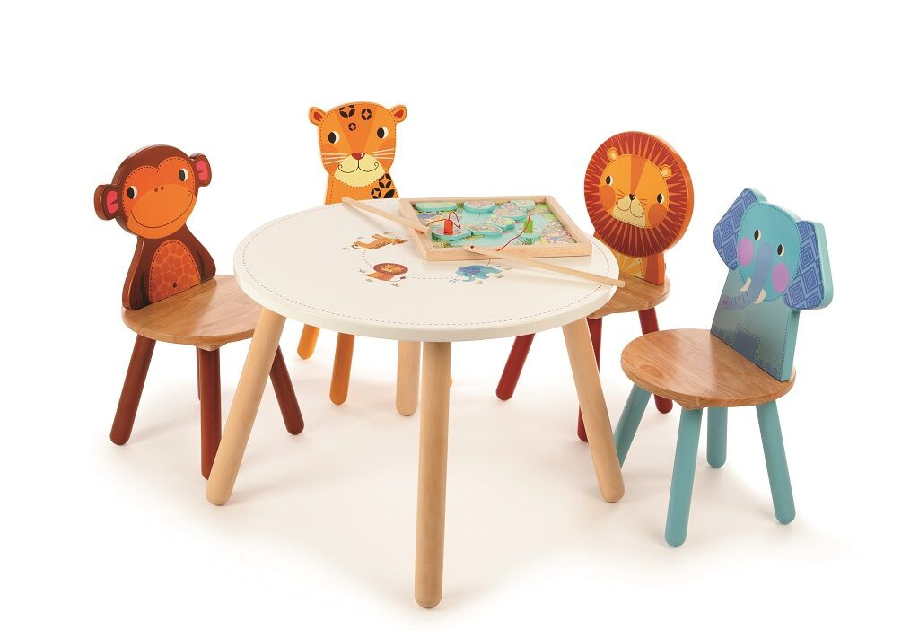 S krásnými ilustracemi lva, slona, leoparda a opice bude tento zvířecí stůl hitem u všech milovníků safari. Má ideální výšku pro děti, může se použít ke hraní i k jídlu a bude se vyjímat v každém dětském pokoji, herně či kuchyni. Používejte pouze doma. Set 4 židlí stejného designu lze dokoupit zvlášť z naší nabídky. Po vybalení je nutno složit. Vyrobeno z kvalitních materiálů z odpovědných zdrojů. Odpovídá evropské bezpečnostní normě.
