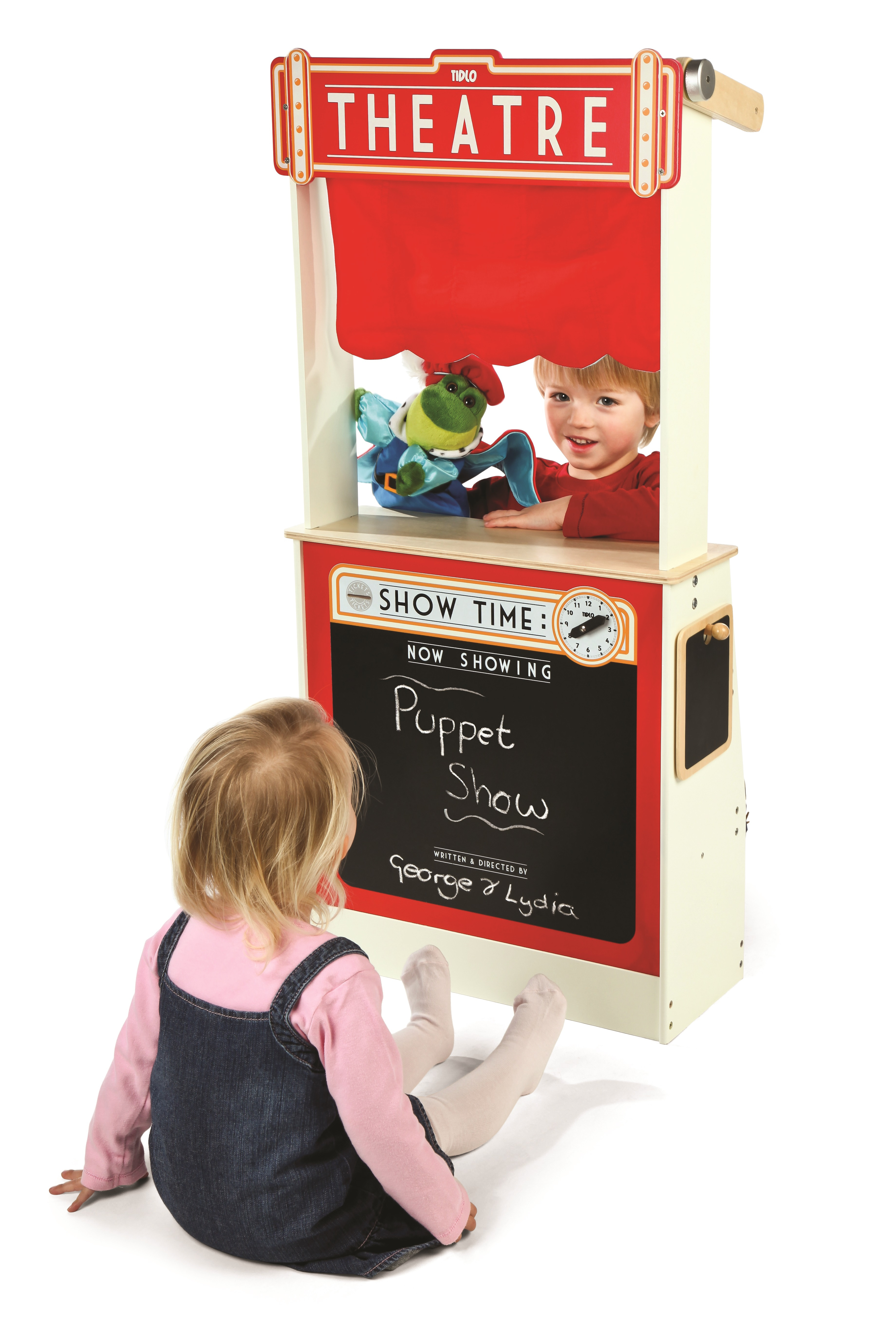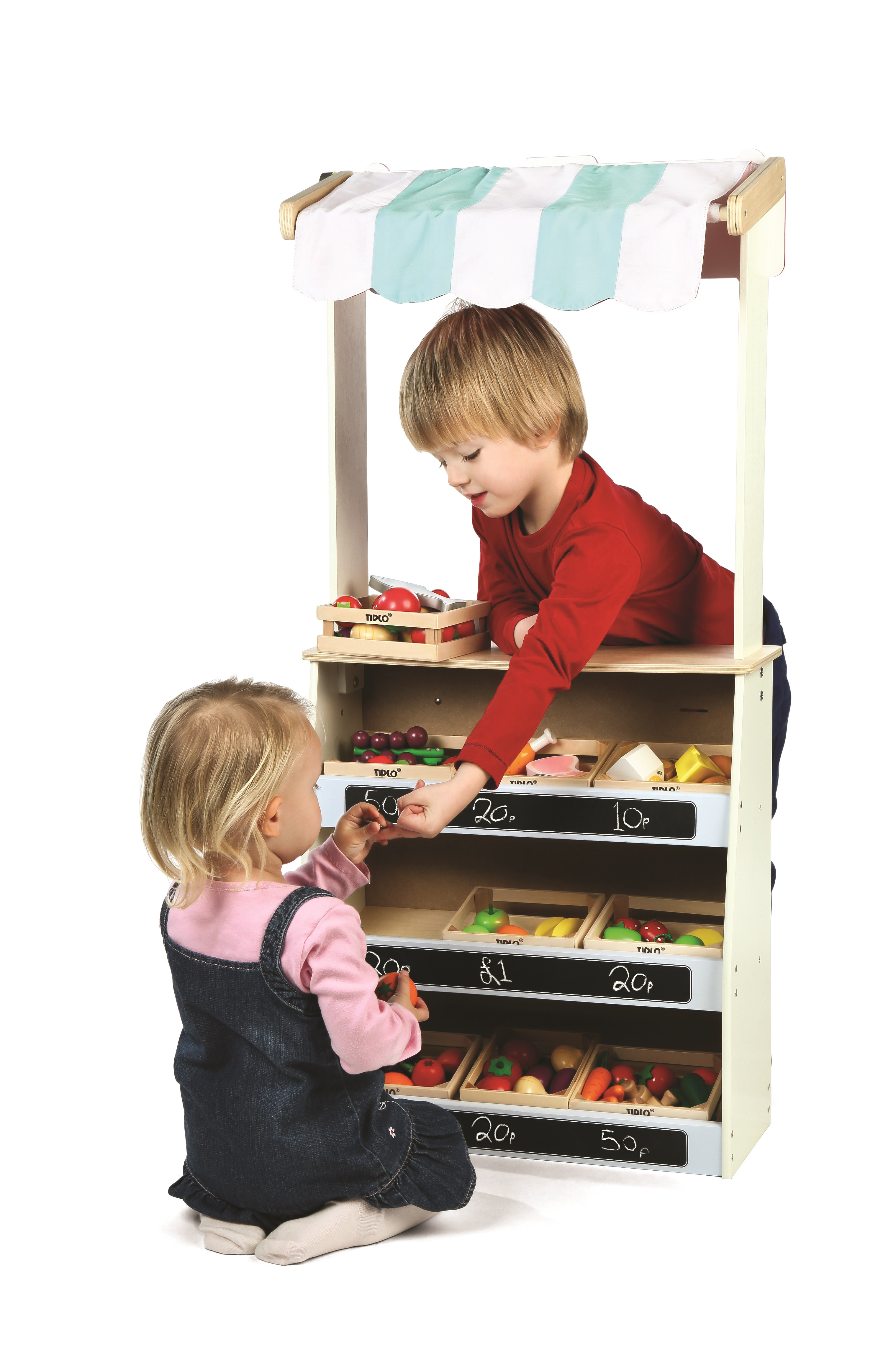 Multifunkční hrací stoleček se stříškou, závěsem, policemi a tabulkami na křídy. Součástí je i malá popisovací tabulka. Bedýnky s potravinami součásti nejsou, lze je dokoupit. Z jedné strany lze stoleček využít jako obchůdek s policemi na uložení potravin - ceny lze pohodlně napsat křídou k naskládanému zboží díky praktickým plochám na popis. Z druhé strany lze stoleček využít jako divadlo. Závěsy se upraví podle potřeby a tabulka umožní zapsat program nebo namalovat plakát. V představivosti se meze nekladou. Vyrobeno z kvalitního dřeva se stabilní konstrukcí.