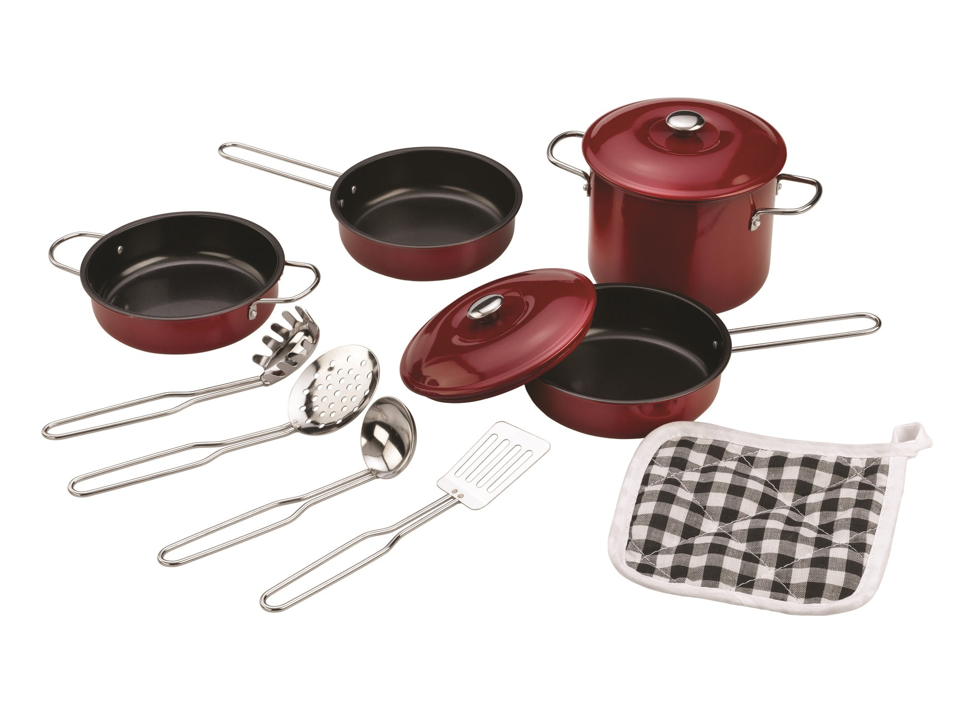 Mladí nastávající kuchaři jistě toto vybavení kuchyně ocení. Set o 11 kusech obsahuje 2 hrnce a 2 pánve, 3 typy naběraček a obracečku a chňapku. Všechno nádobí bylo zmenšeno, aby s ním mohly dobře pracovat i malé dětské ruce. Skvělý způsob jak děti naučit vařit různá jídla a dodržovat bezpečnost v kuchyni. Podporuje kreativní a představivou hru. Rozvíjí koordinaci ruka-oko, jemnou motoriku a zručnost. Odpovídá evropské bezpečnostní normě.