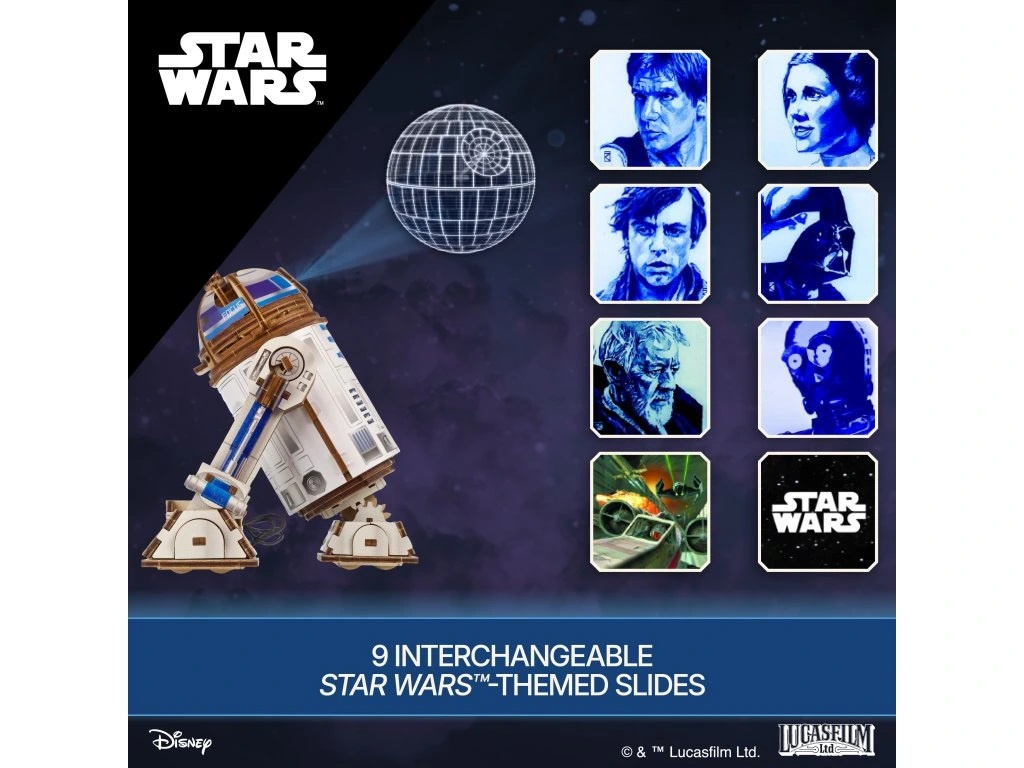 Je malý, ale šikovný! Dřevěný model z barevné překližky má mnoho detailů a věrně zachycuje design tohoto oblíbeného droida. R2-D2 sloužil legendárním hrdinům jako je Anakin Skywalker, Padmé Amidala, Luke Skywalker… nyní je připraven sloužit vám. Je vybaven pohyblivými nohami, které lze nastavit do dvou pozic, a funkčním LED projektorem, přes který odhalí obrázky postav ze Star Wars. Kouzlo galaxie může přinést i do vaší poličky.