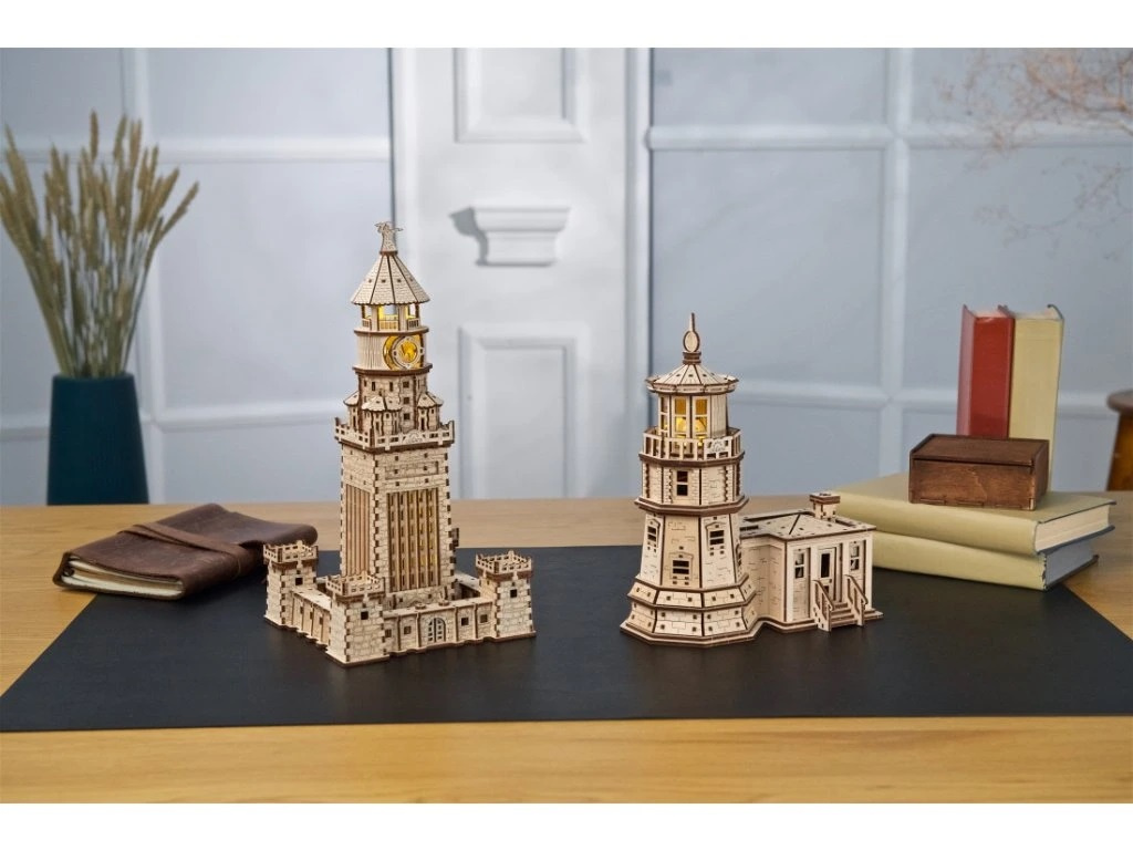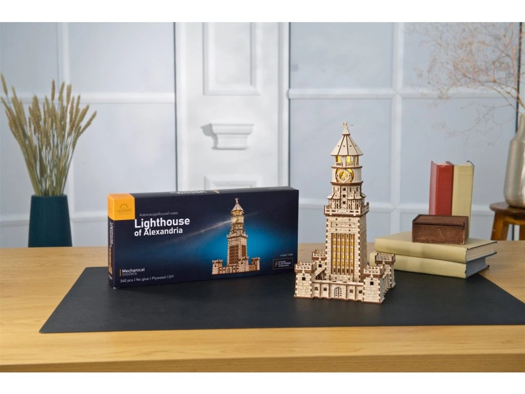 Oživte historii sestavením Alexandrijského majáku. Model je vybaven LED světly a elektrickými součástkami, které maják osvětlují zevnitř, takže je zároveň pěknou i funkční dekorací pro Váš noční stolek. Dřevěný model Alexandrijského majáku je fascinující replikou připravenou k sestavení. Protože byl alexandrijský maják zasvěcen Diovi, je náš model zakončen vyrytým výřezem krále bohů, který svírá blesk. Různorodé detaily dodávají celému objektu architektonickou zajímavost a laserové gravírování napodobuje vzhled kamenných kvádrů a šindelů. Model má také pohyblivou součást: brány v podstavci vpředu i vzadu, které se otevírají otočnými knoflíky. Vybaveno detailním návodem k sestavení.