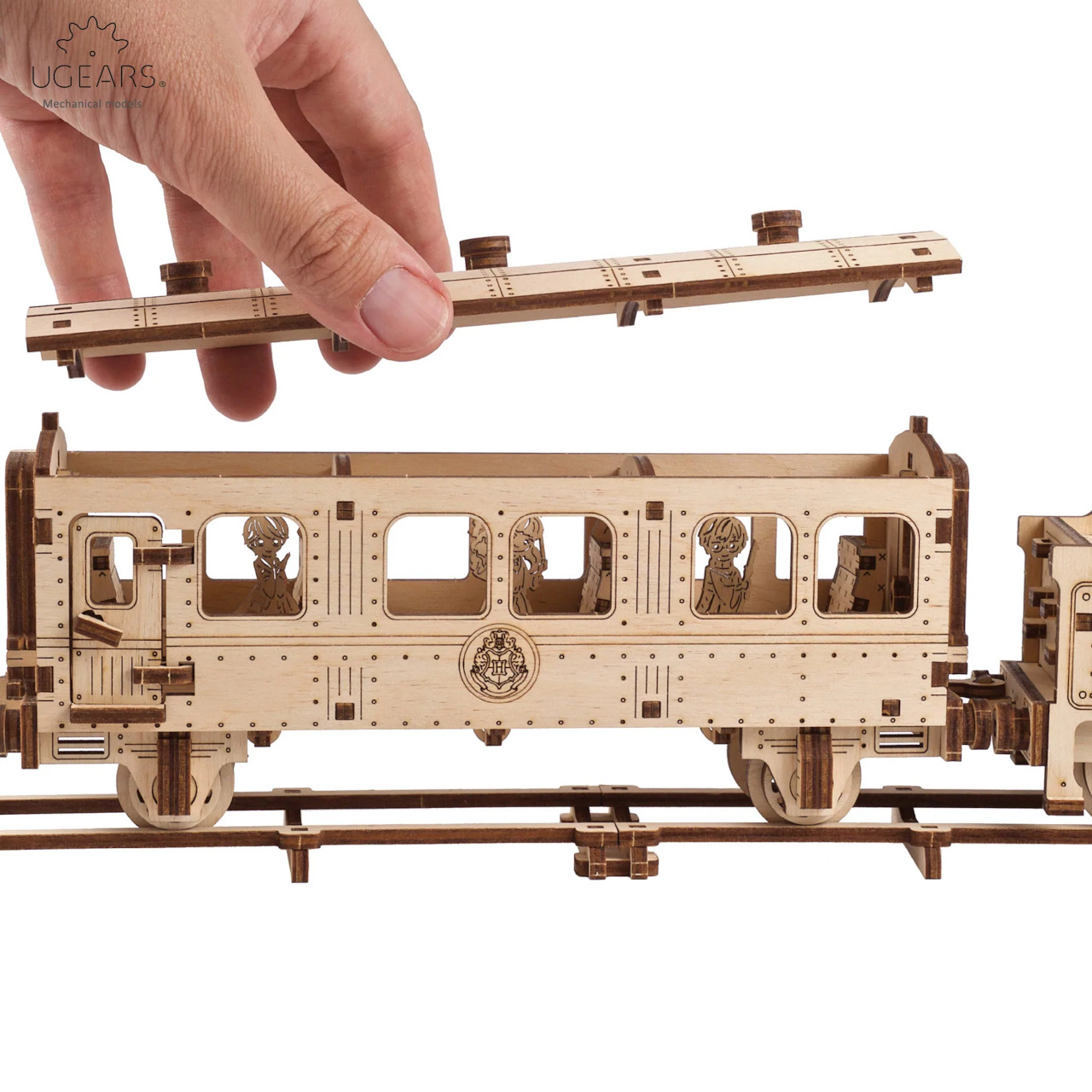 Vysoký výkon, spolehlivost a dlouhou životnost natahovacího pohonu lokomotivy zajišťuje silná kovová pružina. Mechanismus se do provozu uvádí pomocí klíče důvtipně ukrytého v tendru a spouště v podobě otáčivého komínu. Otevřená konstrukce umožňuje za chodu spokojeně obdivovat poutavý pohyb soukolí. Neopomenutelnou atrakci představuje také věrně zpracovaný, funkční klikový mechanismus. Model dále oživuje řada otevíratelných dvířek, které zpřístupňují interiér vagónu. Ten je navíc opatřen odnímatelnou střechou, a v prostoru cestujících je tak možno snadno rozestavět obsažené figurky trojice mladých čarodějů. Jsou‑li postavy umístěny do předpřipravených kolébek, při startu a zastavení se navíc realisticky naklání. Součástí stavebnice je také krátký úsek trati, na které může být model vystaven. Vybaveno detailním návodem k sestavení.