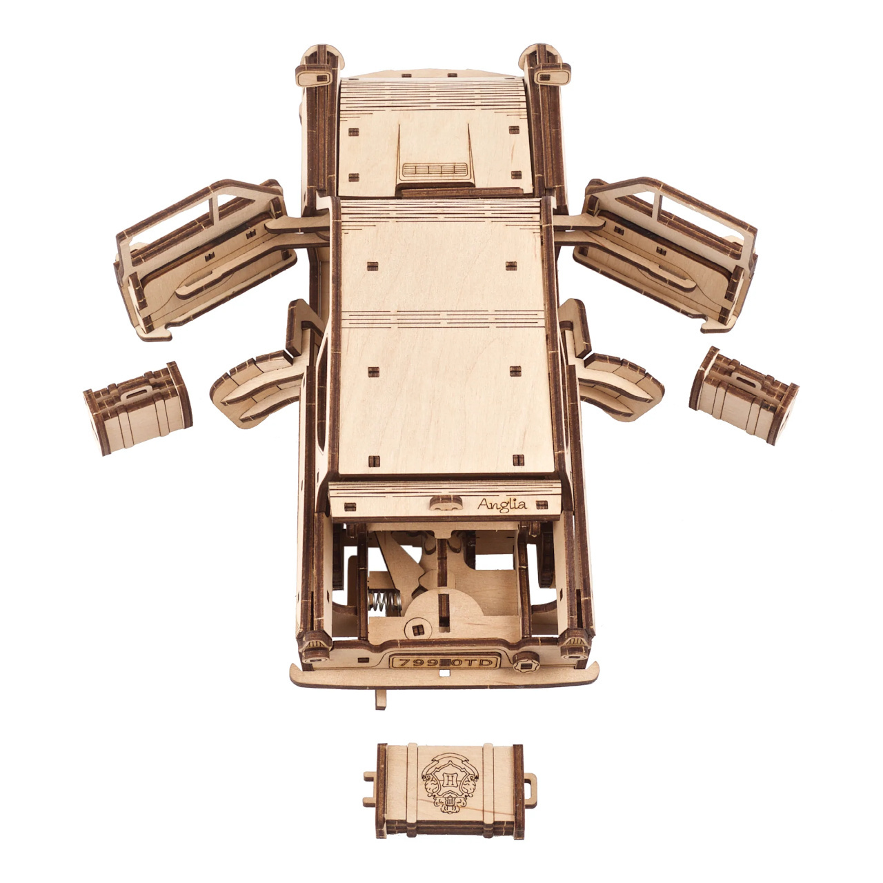 Věrně ztvárněný model je řiditelný a vybavený pružinovým natahovacím pohonem, s pomocí kterého dokáže urazit až čtyři metry! Díky gumovým páskům na kolech bude nezávisle na jízdním povrchu vždy držet rychlost i směr. Ke spouštění a zastavení autíčka slouží tlačítko v podobě zadní registrační značky, jednoduchá převodovka pak umožňuje běh motoru na prázdno. Největší zábavu ovšem ukrývá tlačítko v podobě přední registrační značky. Otevíratelné dveře a kufr ukrývají prostory, do kterých lze uložit drobná zavazadla. Nárazem, nebo stisknutím značky na čele se dveře i kufr otevřou, dojde k vyklopení sedaček a s nimi i všech zavazadel. Přesně tak jako v ikonické scéně nárazu auta do vrby mlátičky! Užijte si kouzelnou legraci a nezapomeňte uspořádat závody s dalšími modely UGEARS! Vybaveno detailním návodem k sestavení.