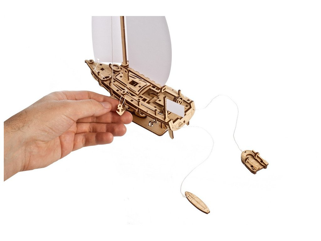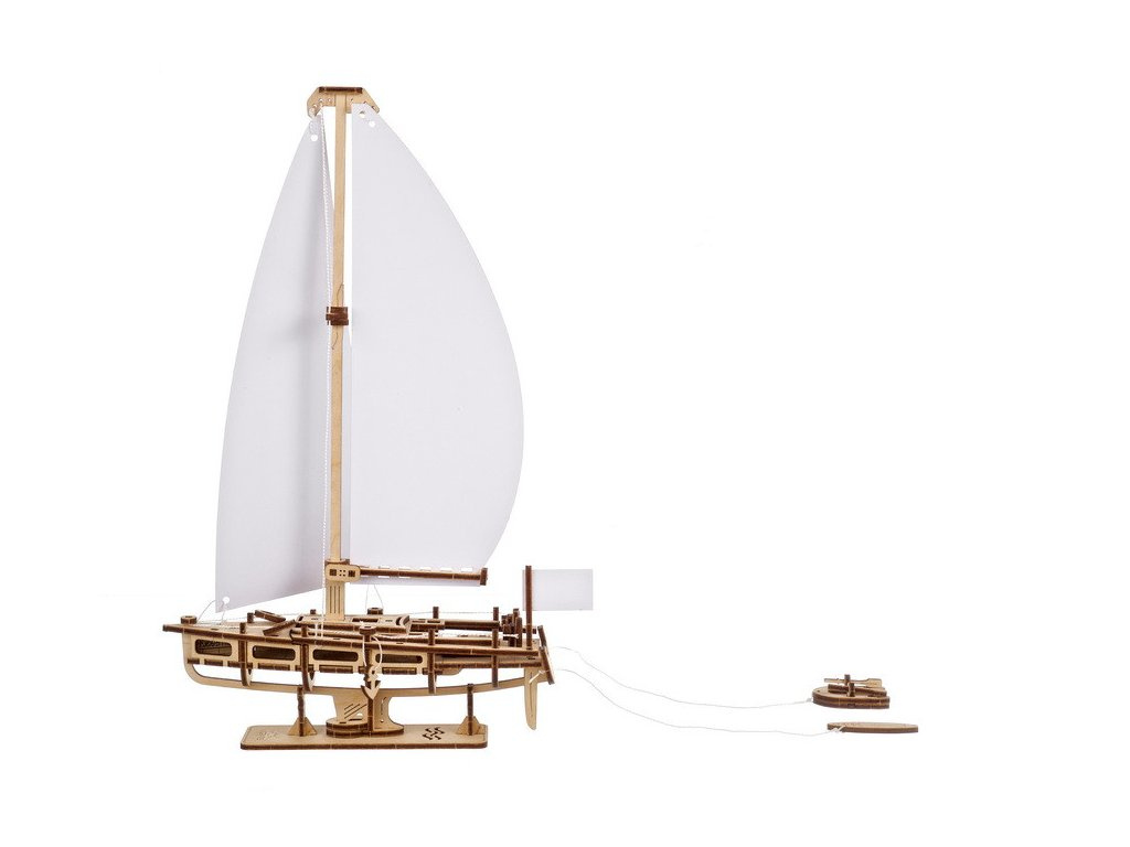 Tento dřevěný model jachty s 3D puzzle má velký kokpit se dvěma kolečky, která se otáčejí (je to Ugears, takže musíme mít nějaké pohyblivé části!), a otevřený příčník pro vypouštění mořské vody, když vás přepadne vlna na zádi v rozbouřeném moři, nebo uvidíte velkou vlnu na přídi, která spláchne palubu. Otevřený příčník je také dobrý pro plavání ze zadní části nebo pro nastupování a vystupování z modelu člunu, taženého za jachtou na laně (je součástí dodávky). Člun je vybaven miniaturními vesly a může v něm sedět figurka podle vlastního výběru (není součástí balení). K dispozici je také surfovací prkno, které lze táhnout pro zábavu nebo v případě, že najdete skvělou vlnu poblíž břehu.