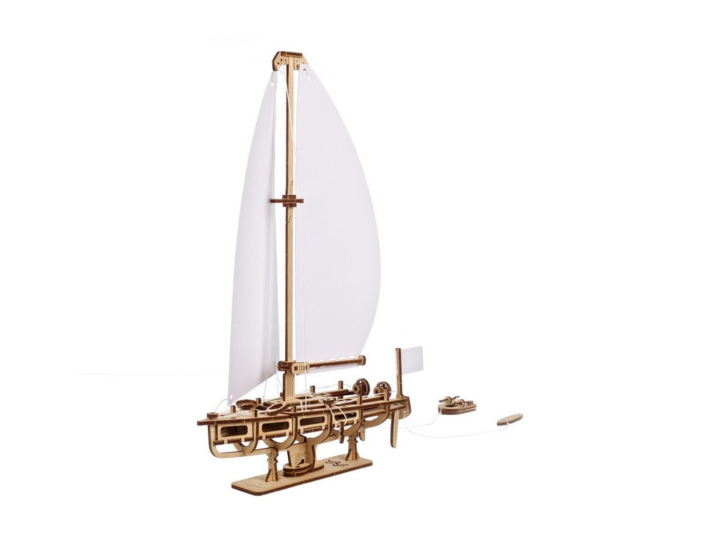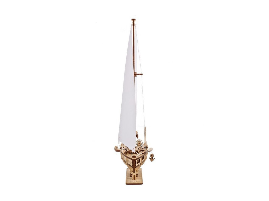 Tento dřevěný model jachty pro kutily má zahnutou hlavní plachtu s výkyvným ráhnem a trojúhelníkový výložník, obojí připevněné k vysokému stěžni s rozpěrným zařízením pro pravý a levý rubáš. Palubu lemují vzpěry a provazové zábradlí. Dvě záchranné vesty a kotva dodávají lodi další realistické prvky. Na zádi je stožár pro vyvěšení vlajky jachty - nechte bílou papírovou vlajku čistou, vybarvěte ji nebo na ni nalepte samolepku či výtisk libovolné státní vlajky nebo vlajky jachtařského klubu.