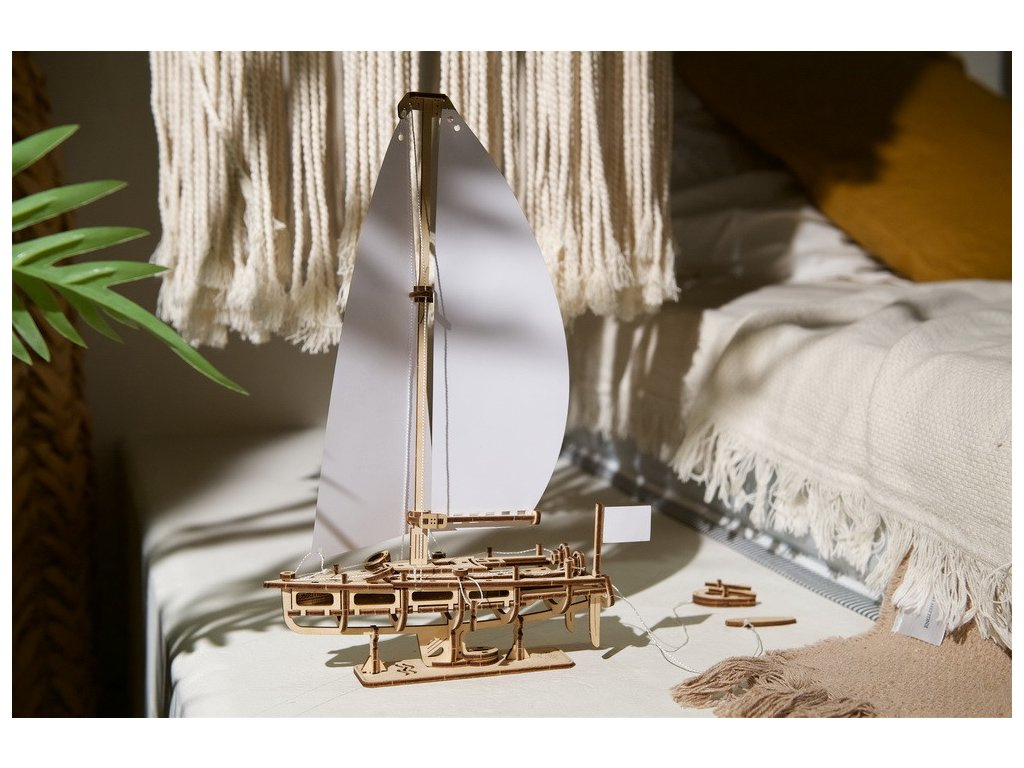 Chyťte vítr, pociťte slaný vánek, vydejte se na moře nebo se vydejte na cestu po ostrovech v úžasné jachtě Ocean Beauty od Ugears. Tento 3D dřevěný model plachetnice je precizní kousek se dvěma zářivě bílými papírovými plachtami a dodává se s vlastním robustním stojanem pro vystavení na poličce, krbu nebo stole. Model se poněkud liší od ostatních mechanických modelů Ugears tím, že jachta nemá převody a není poháněna pružinovým nebo gumovým motorem - je určena spíše jako pohledný výstavní kus pro výzdobu vašeho domova nebo kanceláře.