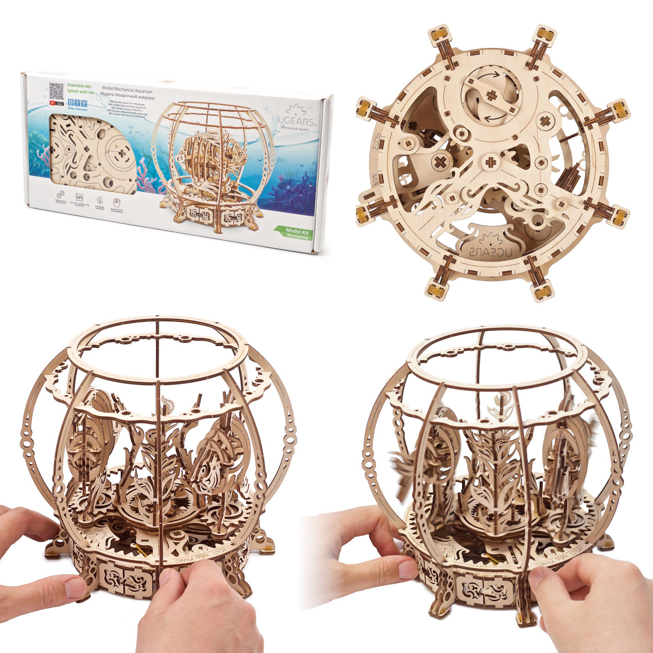 Uklidňuje Vás pohled do akvária? Stavebnice mechanického akvária z překližky. Natahovací mechanismus pohání dvojici ryb imitujících plavání po obvodu akvária a otáčí detailně vyřezávanou rostlinou uprostřed. Mechanika je odhalená tak, abyste mohli pozorovat ústřední planetové soukolí a je vybavena spouští. Model mezi ostatními řezbami zdobí také detail malého mořského koníka. Vybaveno detailním návodem k sestavení.