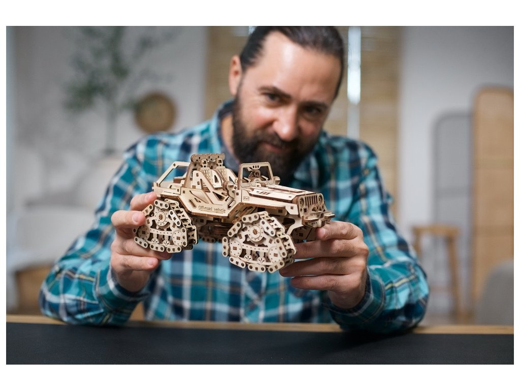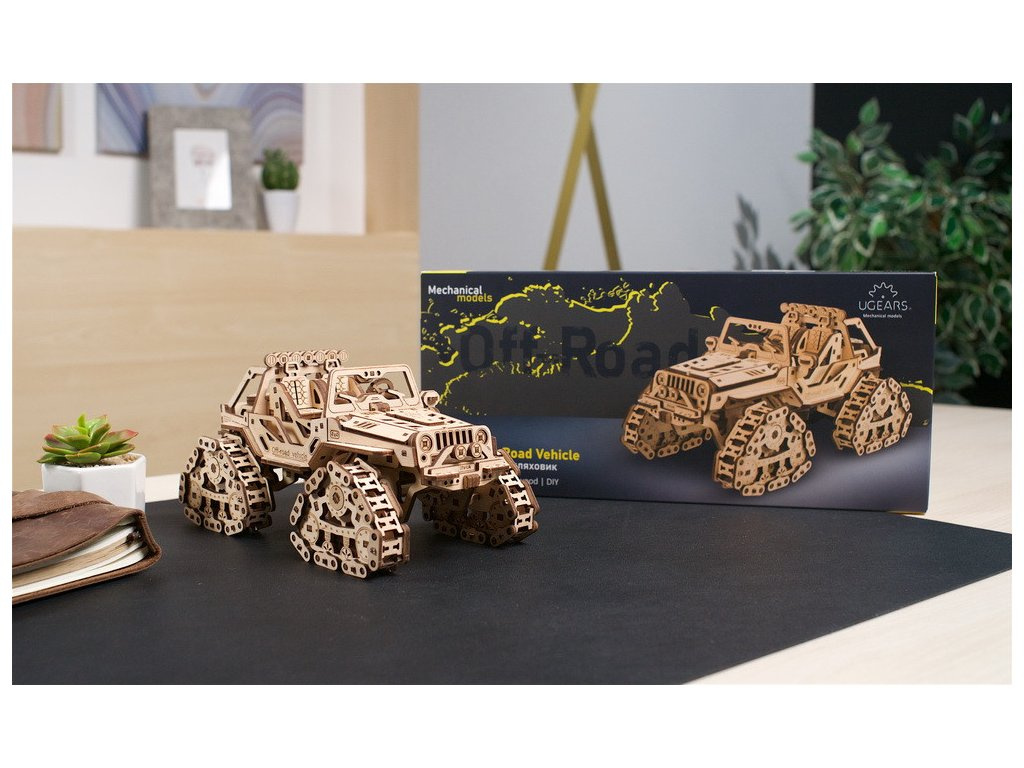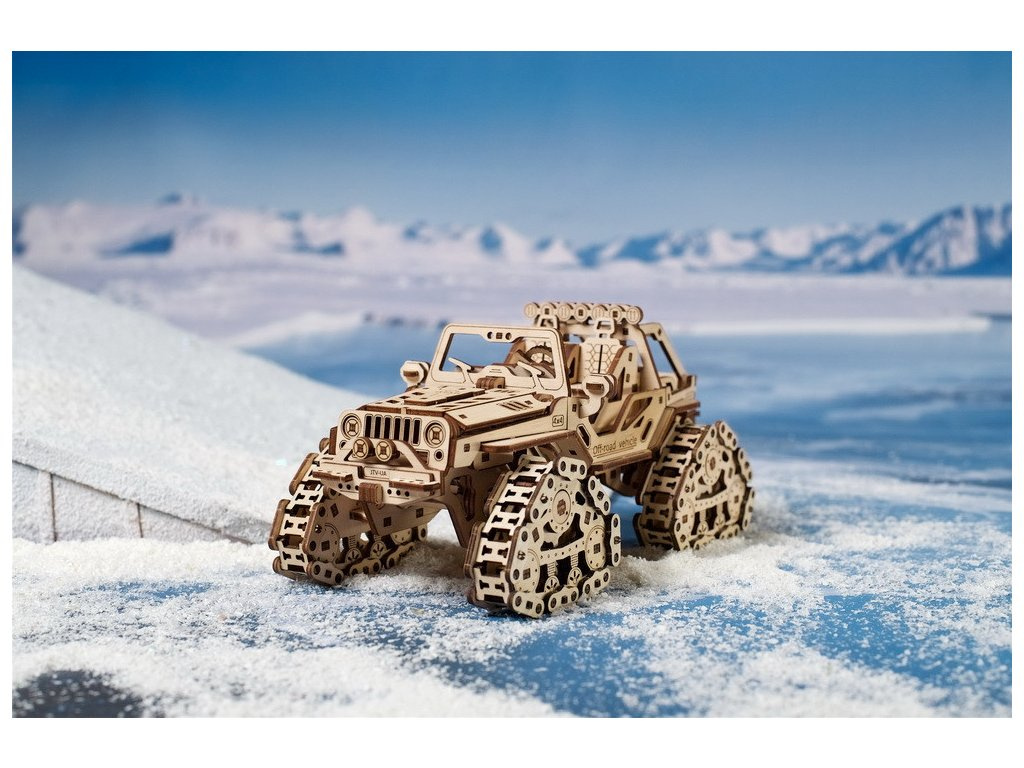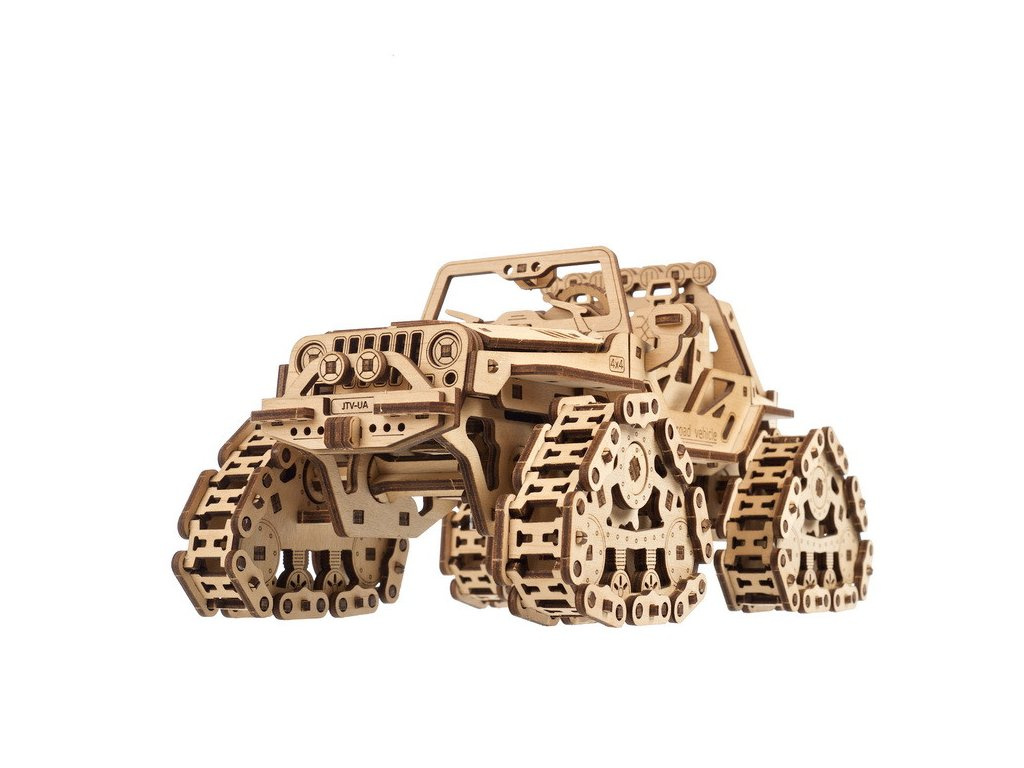 Tato série dřevěných hraček 3D puzzlí je určena především pro pány kluky a jejich tatínky, kteří se rádi se svými dětmi vracejí do svého dětství. Pásové terénní vozidlo pohání gumička, která po správném navinutí umožňuje vozidlu urazit trasu dlouhou přes 3 metry v režimu D (Drive) a více než 4 metry v režimu S (Sport). Má otevřenou kabinu, čtyři kola s pohonem, kapotu, která se otevírá a ukazuje motor a pásů, jako jsou Mattracks, Rubtrack a systémy jiných výrobců. Lze je přišroubovat k ráfkům ORV, traktorům a záchranářským vozidlům. Ráčnový mechanismus je umístěný na podvozku modelu. Řadící páka funguje jako spínač "Zapnuto/Vypnuto". Před navinutím přepněte do režimu P (parkování), položte ORV na povrch, přidržte jej během posunutí řadící páky do režimu D, nebo mírně zvedněte řadící páku dále zpět do režimu S a poté model uvolněte. Kyvadlo umístěné vzadu zajišťuje, aby se vozidlo pobybovalo pomaleji. Model ORV je v měřítku 1:24 oproti originálu.