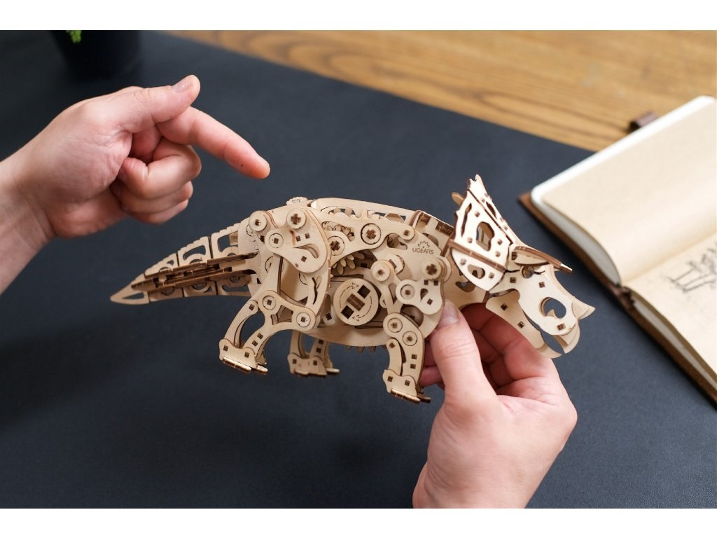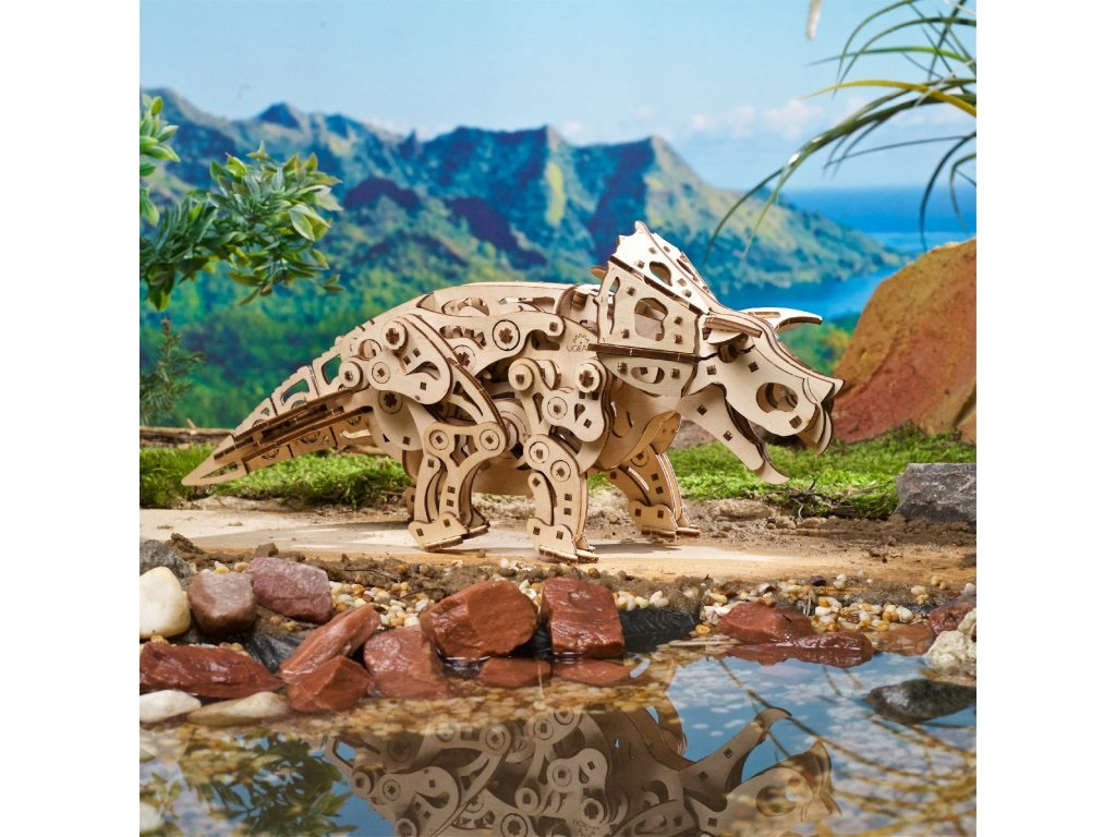 Dřevěný pohyblivý 3D model Triceratopse může být originálním dárkem nejen pro děti! Díky gumičkovému setrvačníku bude chodit po místnosti a kývat u toho hlavou i ocasem. Rozhodněte sami, zda se stane atraktivní dekorací, nebo hodnotnou hračkou.