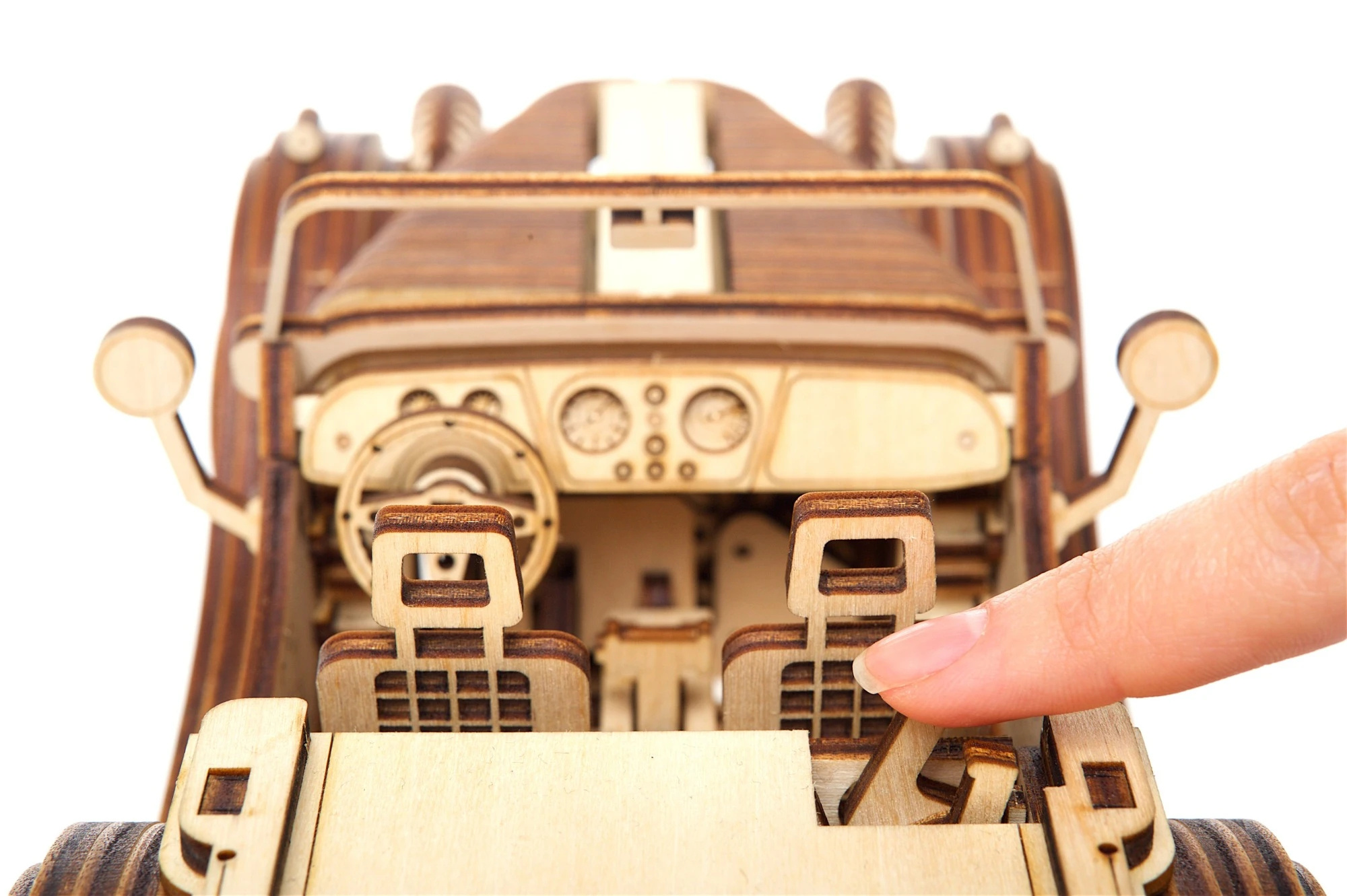 Milovníkům rychlosti a starých časů. Stavebnice autoveteránu typu roadster vyrobená z překližky. Model disponuje otevíracími dveřmi a odklopnou kapotou. Mechanika je do detailu propracovaná, a vy tak můžete pozorovat pohyb pístů motoru. Vůz je řiditelný a díky natahovacímu mechanismu je schopen jízdy, na jedno natažení urazí až 4 m. Má také funkční převodovku pro volnoběh a zpátečku. Uspořádejte závody s dalšími modely UGEARS! Vybaveno detailním návodem k sestavení.