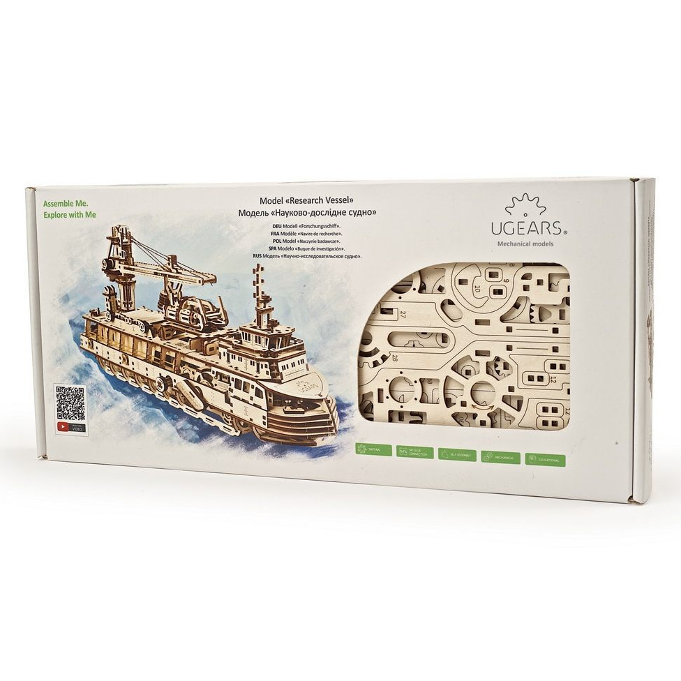Plnou parou do neznáma! Stavebnice oceánografické lodi vyrobená z překližky. Její sestavení je výzvou i pro zkušenější stavitele, za to se Vám bohatě odmění záplavou funkčních detailů a snadno se stane ozdobou vitríny. Loď je vybavena natahovacím pohonem opatřeném spouští, jeho mechanismus je částečně odhalený a lze jej za chodu pozorovat. Směr jízdy je možno manuálně ovládat, nebo nechat loď převodem samu atraktivně kličkovat. Kolečka jsou pro jistý kontakt s povrchem dráhy opatřena gumovými kroužky. Na palubě lodi naleznete propracovaný funkční jeřáb, jehož pomocí můžete manipulovat s detailním modelem batyskafu vybaveném funkčními čelistmi. Ponorku lze umístit na posuvnou plošinu na palubě, nebo do bezpečí i jinak využitelného nákladového prostoru v podpalubí. Plavidlo je také doplněno podrobnostmi v podobě záchranného člunu a miniponorky. Vybaveno detailním návodem k sestavení.