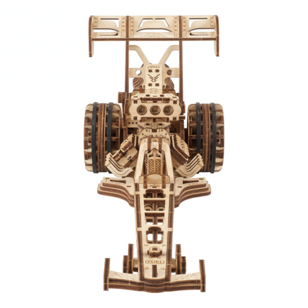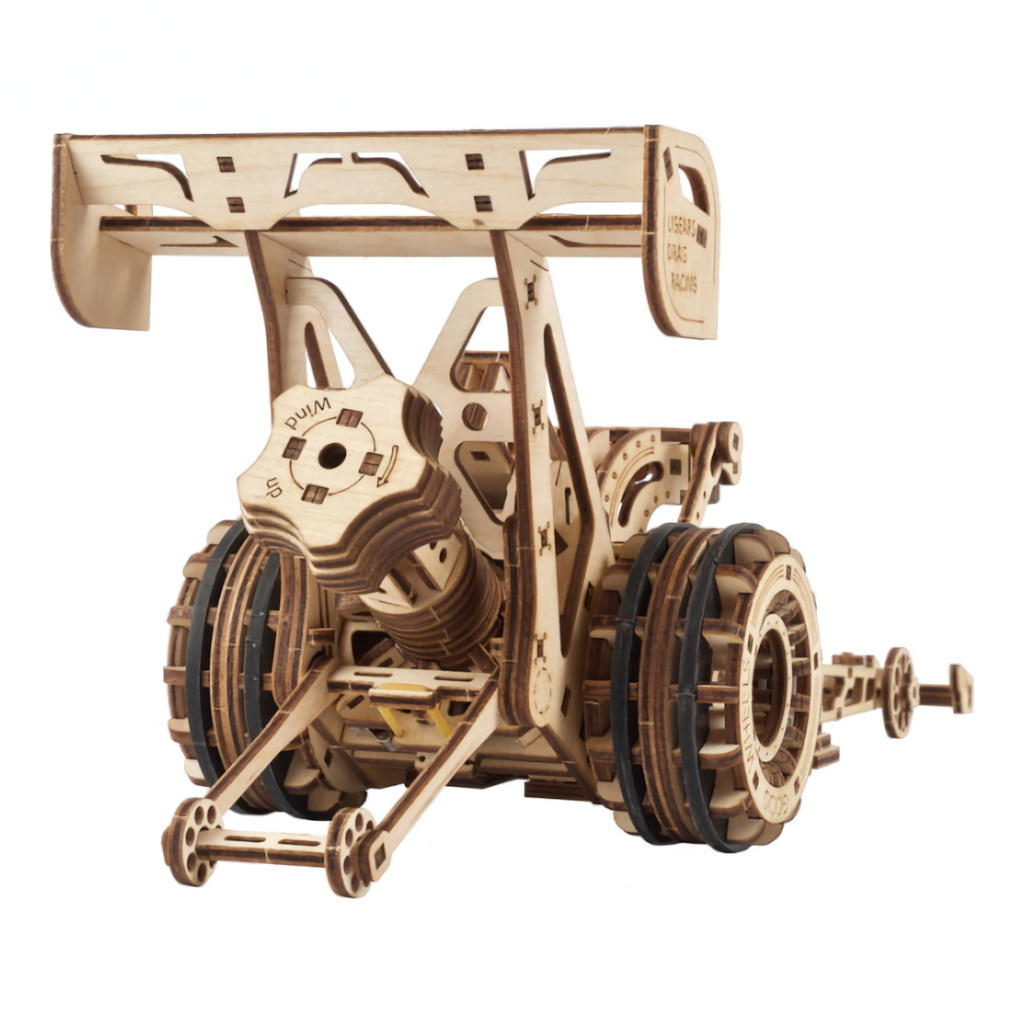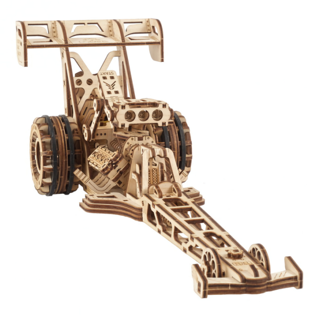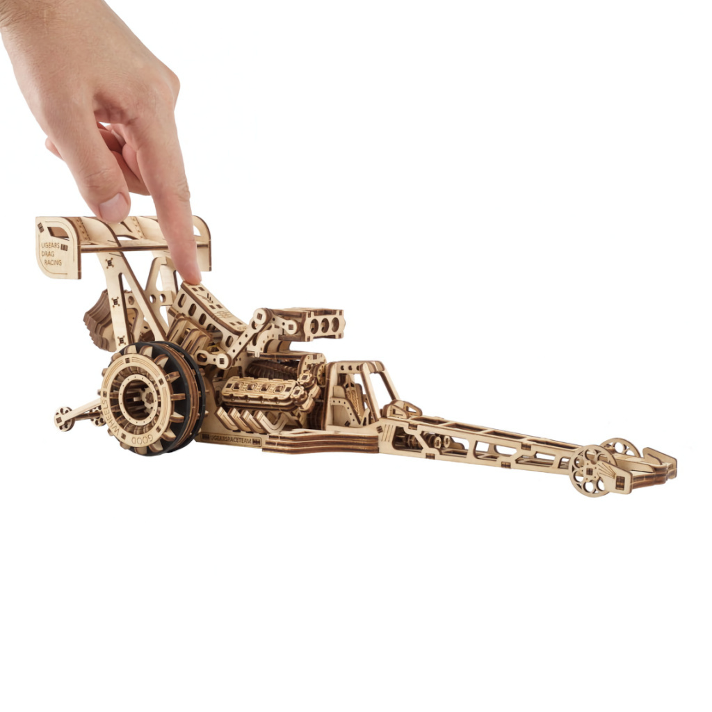 Za řevu motorů a vůně benzínu! Stavebnice závodního auta vyrobená z překližky. Zrychlete na hranice možností a nechejte se unést účelností konstrukce těch nejvýkonnějších vozů. Tvarem připomínajícím vážku se dragster stane jedinečnou ozdobou poliček v pokojích i kancelářích. Model je však stvořený k závodům ve sprintu, a je proto vybavený silným pružinovým motorem s dlouhou životností. Točivý moment je řemenem přenášen na pár velkých zadních kol, která jsou opatřena silikonovými kotouči upravujícími těžiště a zajišťujícími co nejlepší kontakt se závodní dráhou. Jízdu lze ovládat jednoduchou spouští a k běžným přesunům je vůz vybaven sklopnými kolečky. Ke sprintu jej připravíte plným natažením a sklopením opěry, pak se teprve stanete svědky „wow“ efektu typického pro závody ve sprintu – dragster se při startu postaví na svá zadní kola a plnou rychlostí vystřelí k cíli. Model podrobnostmi potěší každého nadšence mechaniky. Můžete pozorovat, jak se stisknutím spouště otevřou klapky sání motoru a díky otevřené konstrukci sledovat detaily pohonu při práci. Uvolněte všechnu tu nezkrotnou sílu a uspořádejte závody s dalšími modely UGEARS! Vybaveno detailním návodem k sestavení.
