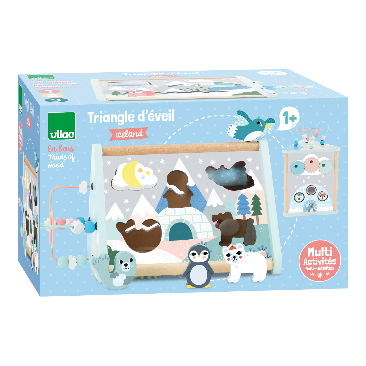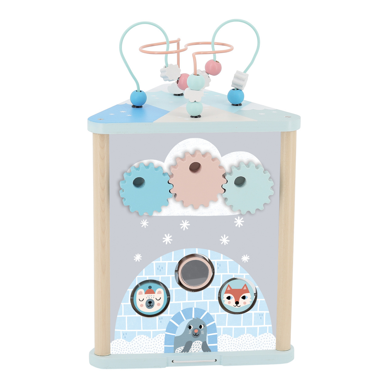 Nechejte se pozvat na výpravu do poetického zimního království návrhářky Michelle Carlslund. Spolu s polárními zvířátky a eskymáky mohou děti prostřednictvím různorodých aktivit rozvíjet jemnou motoriku, orientaci v prostoru a poznávací dovednosti. Na stěnách hranolu naleznete korálkové bludiště, vkládačku, chrastící válec, ozubená kolečka, řadu dalších posuvných i otáčivých prvků a pružně upevněná dvířka zpřístupňující vnitřní prostor. Svou jedinečnou barevností a motivy se hračka stane opravdovou ozdobou dětského pokoje.