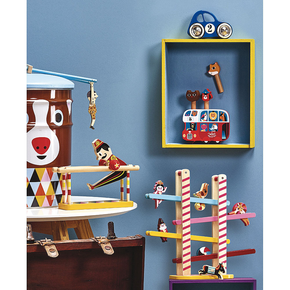 Modré autíčko vyrobené z lakovaného dřeva s kovovými pogumovanými koly. Autíčko je speciální v tom, že zatáčí doleva a doprava díky speciálnímu řešení nápravy. Vyrobeno ve Francii.
