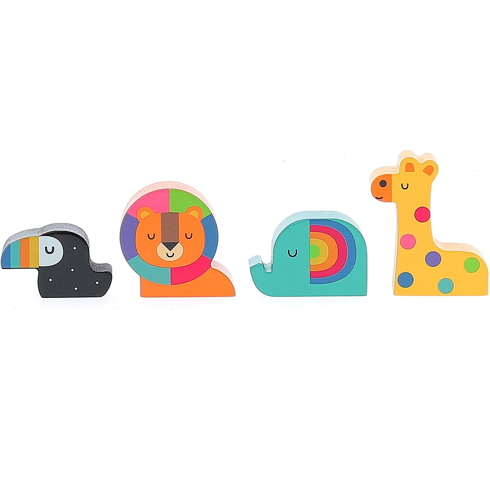 Nechejte děti objevovat duhový svět roztomilých zvířat výtvarníka Andyho Westface s tímto barevným skládacím vláčkem. Kostky mají různé velikosti, tvary a barvy s poutavým vyobrazením zvířat. Mašinka a vagónky jsou spojeny magnetem.
