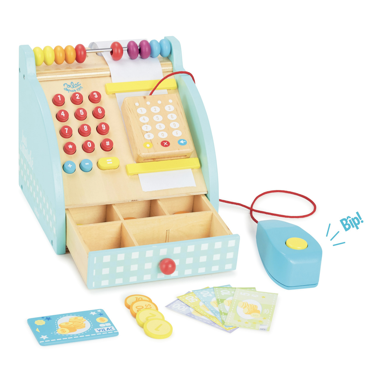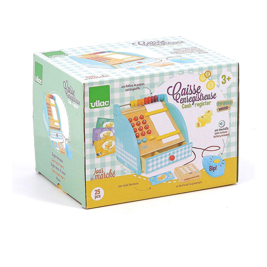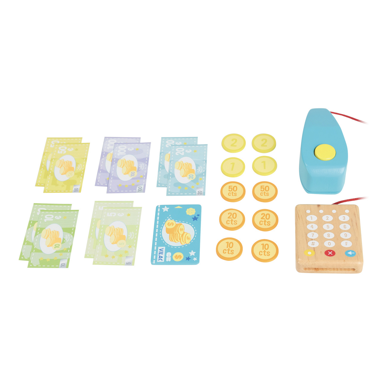 Dřevěná pokladna s šuplíkem na peníze, počítadlem a bankovním terminálem. Obsahuje také klasické zvukové tlačítko a funkční numerickou klávesnici. Mezi doplňky patří bankovky a mince.