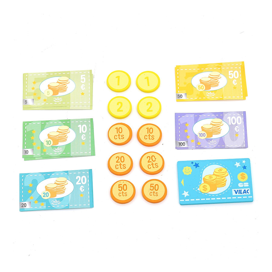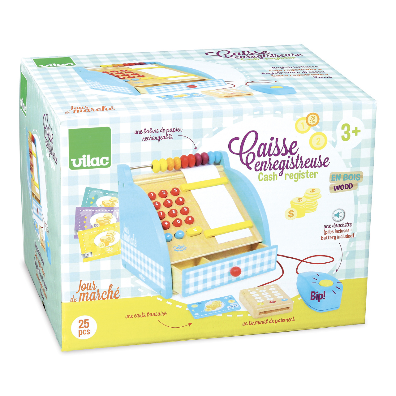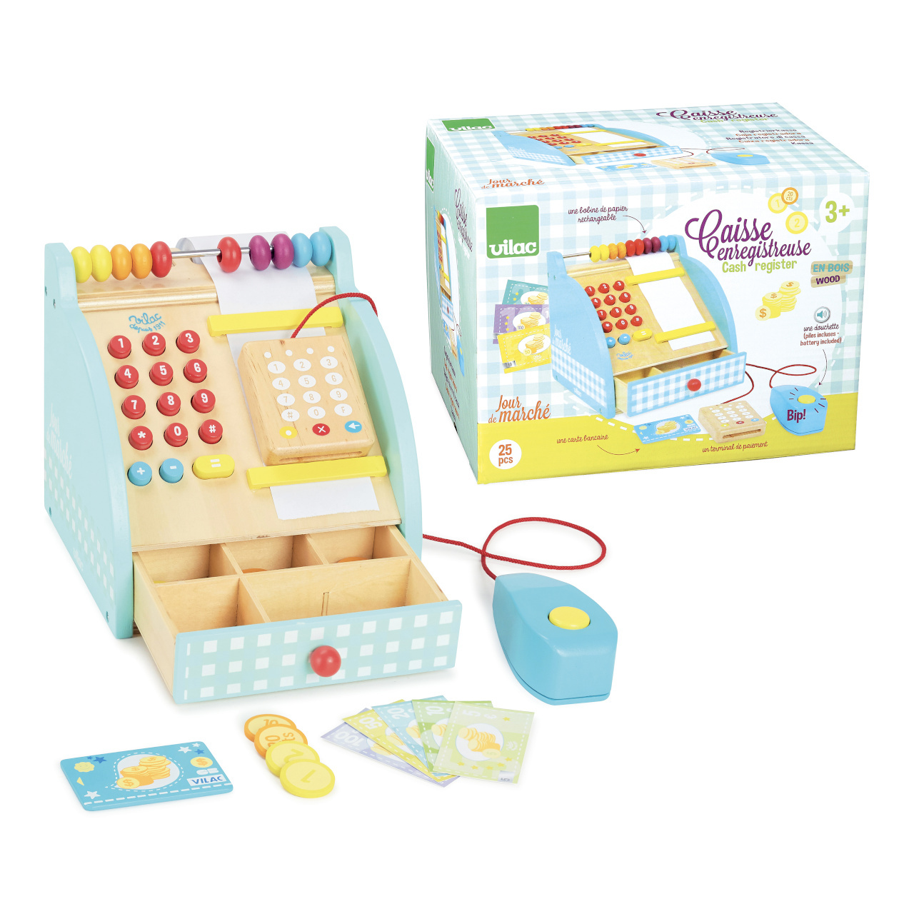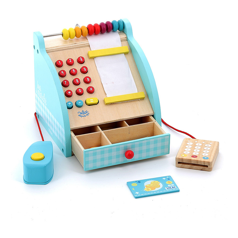 Dřevěná pokladna s šuplíkem na peníze, počítadlem a bankovním terminálem. Obsahuje také klasické zvukové tlačítko a funkční numerickou klávesnici. Mezi doplňky patří bankovky a mince.