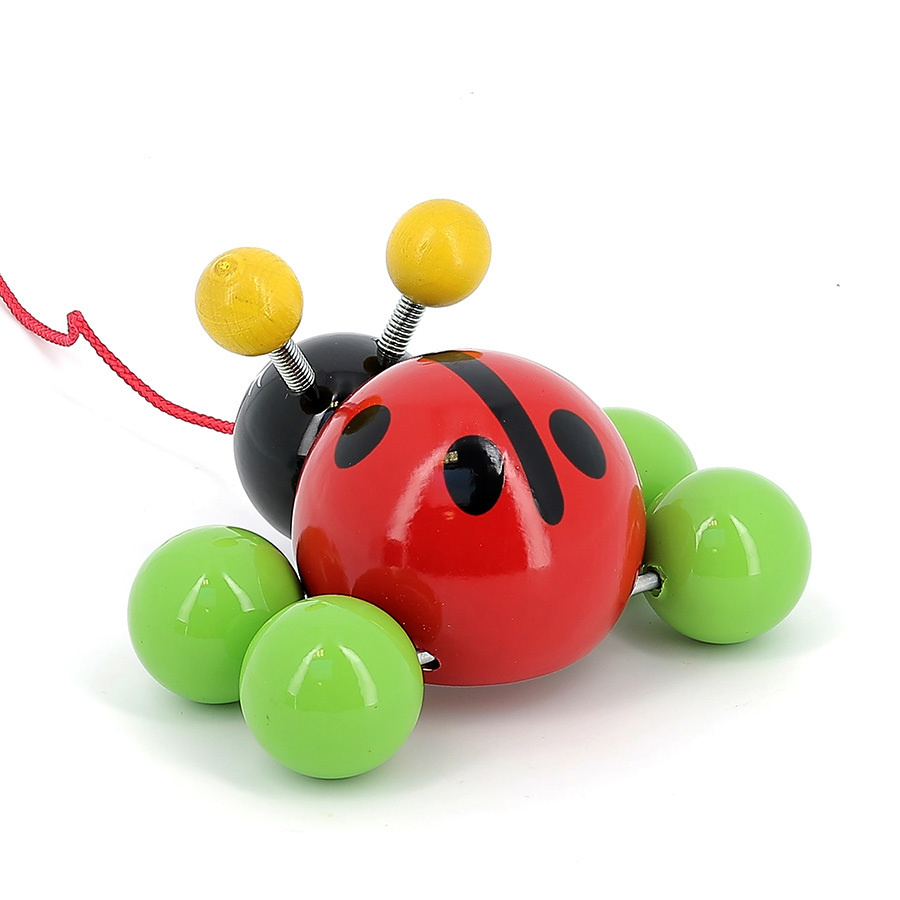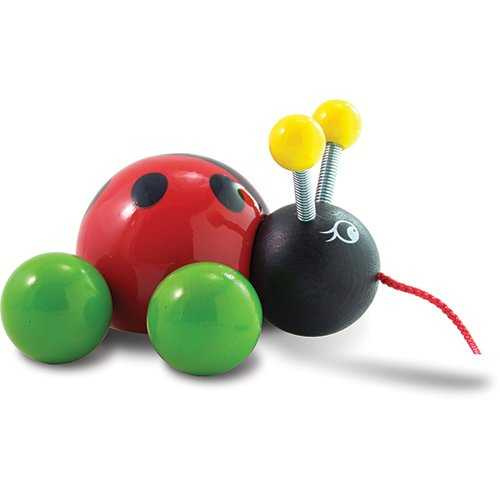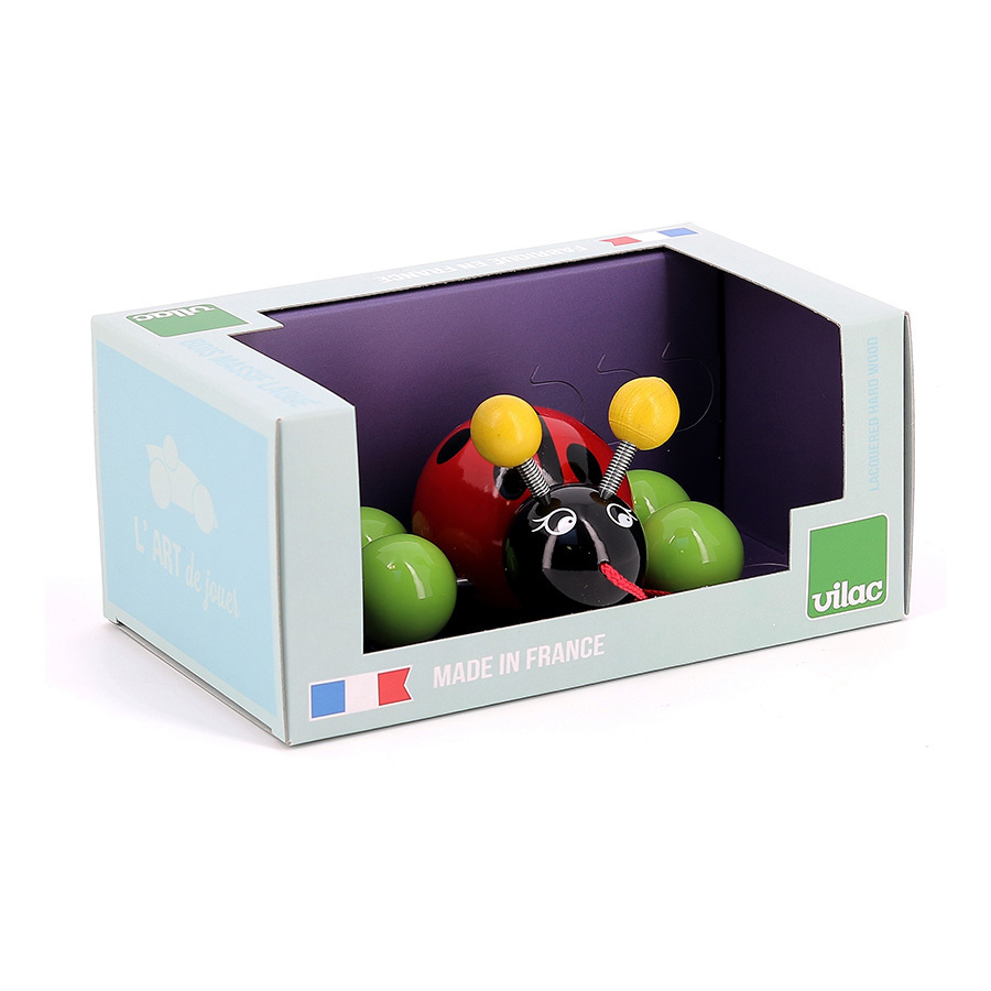 Dřevěná tahací beruška z lakovaného masivu, s tykadly na pružince. Ty se při tahání pohybují. Vyrobeno ve Francii.