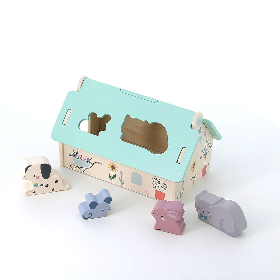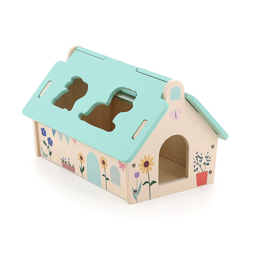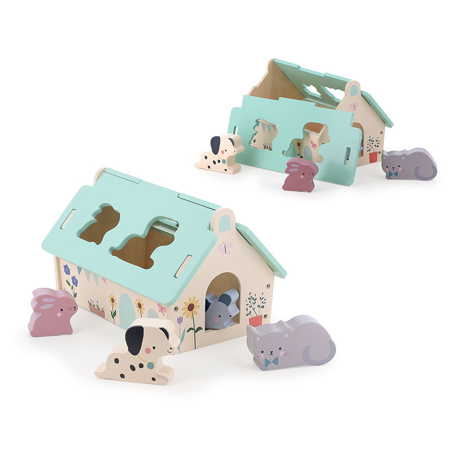 Kdopak to bydlí v tomto malebném dřevěném domečku? Pejsek, myška, kočička a králík. Vkládačka ve tvaru domečku podle návrhu Sarah Betz potěší každé dítě. Domeček v jemných barvách s motivy květin má odnímatelnou střechu s tvarovanými otvory pro vkládání zvířátek. Jedná se o ranou hračku inspirovanou Montessori. Při hře děti rozvíjejí mnoho dovedností jako je soustředění, obratnost, motorika, trpělivost a koordinace ruka-oko. Naučí se manipulovat se zvířátky tak, aby se vešla do odpovídajících otvorů a rozvíjejí svou představivost, když si budou jen tak hrát s s figurkami zvířátek a domečkem.