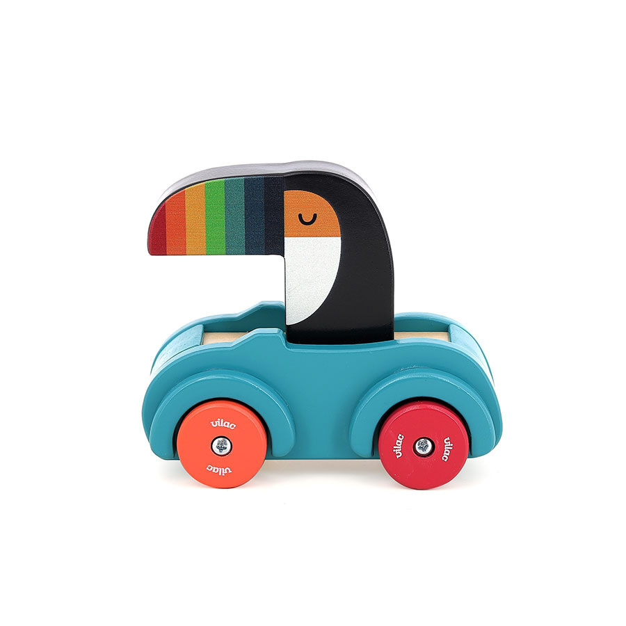 Dřevěné autíčko v modré barvě s barevnými koly, ve kterém sedí tukan s barevným zobákem. Pod tukanem je zabudován klakson, proto když dítko zatlačí na hlavu tukana, ozve se zatroubení. Tento zvukový detail stimuluje zájem batolat a zároveň jim poskytuje přímou interakci s hračkou. Hračka je dokonale přizpůsobena pro malé ruce a rozvíjí fantazii, jemnou motoriku a koordinaci ruka-oko.