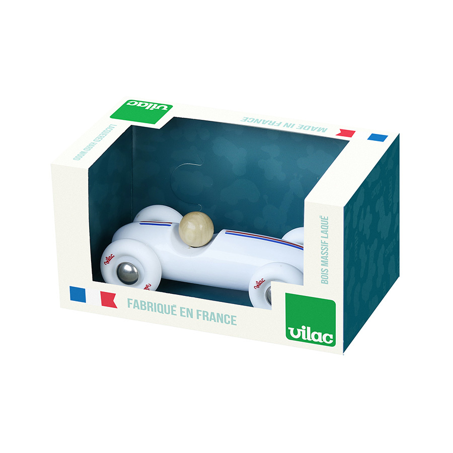 Model bílého vintage auta ze závodu Grand Prix. Vyrobeno z lakovaného dřeva ve Francii. Má velká bílá gumová kola, která zajišťují tichý chod na všech podlahách.