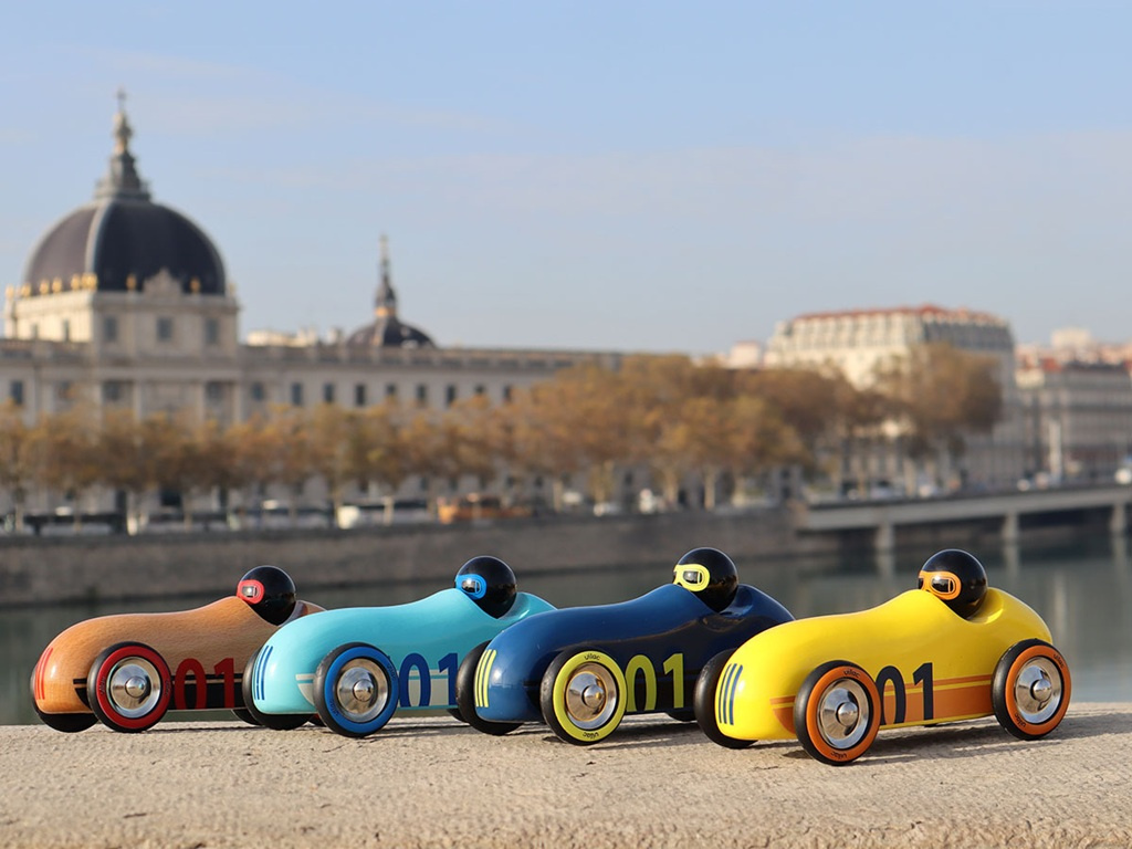 Neobyčejné autíčko oblých aerodynamických tvarů v jedinečném designu, které je určeno ke hraní i jako atraktivní doplněk interiéru či sběratelský kousek. Při hře s autíčkem využívá dítě mnoho dovedností: jemnou motoriku, obratnost, představivost, kreativitu. Může reprodukovat zvuky motoru nebo sirén, parkovat do garáže, projíždět se. Hraním s ostatními dětmi nebo členy rodiny se učí sdílet, spolupracovat a napodobovat, čímž rozvíjí důležité sociální dovednosti. Autíčko je vyrobeno z masivního bukového dřeva, lakováno ručně bezpečnými barvami tradičním procesem ponoření do lázně s barvou. Vyrobeno ve Francii, dodáváno v potištěné krabičce.