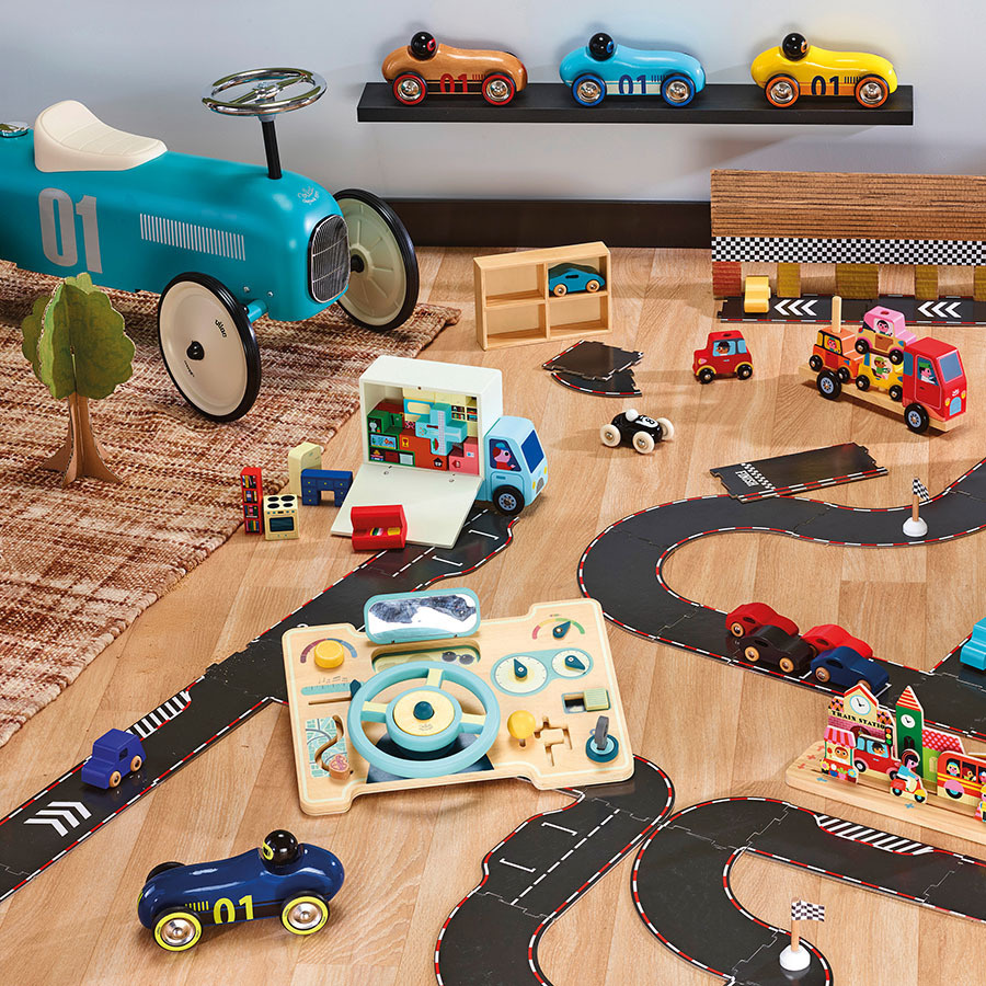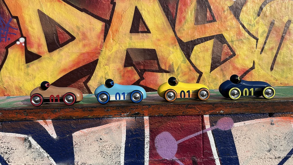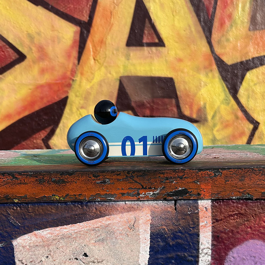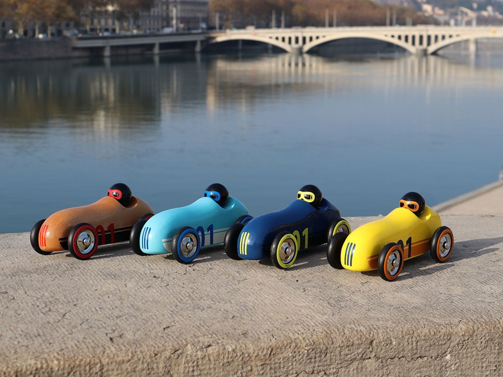 Neobyčejné autíčko oblých aerodynamických tvarů v jedinečném designu, které je určeno ke hraní i jako atraktivní doplněk interiéru či sběratelský kousek. Při hře s autíčkem využívá dítě mnoho dovedností: jemnou motoriku, obratnost, představivost, kreativitu. Může reprodukovat zvuky motoru nebo sirén, parkovat do garáže, projíždět se. Hraním s ostatními dětmi nebo členy rodiny se učí sdílet, spolupracovat a napodobovat, čímž rozvíjí důležité sociální dovednosti. Autíčko je vyrobeno z masivního bukového dřeva, lakováno ručně bezpečnými barvami tradičním procesem ponoření do lázně s barvou. Vyrobeno ve Francii, dodáváno v potištěné krabičce.