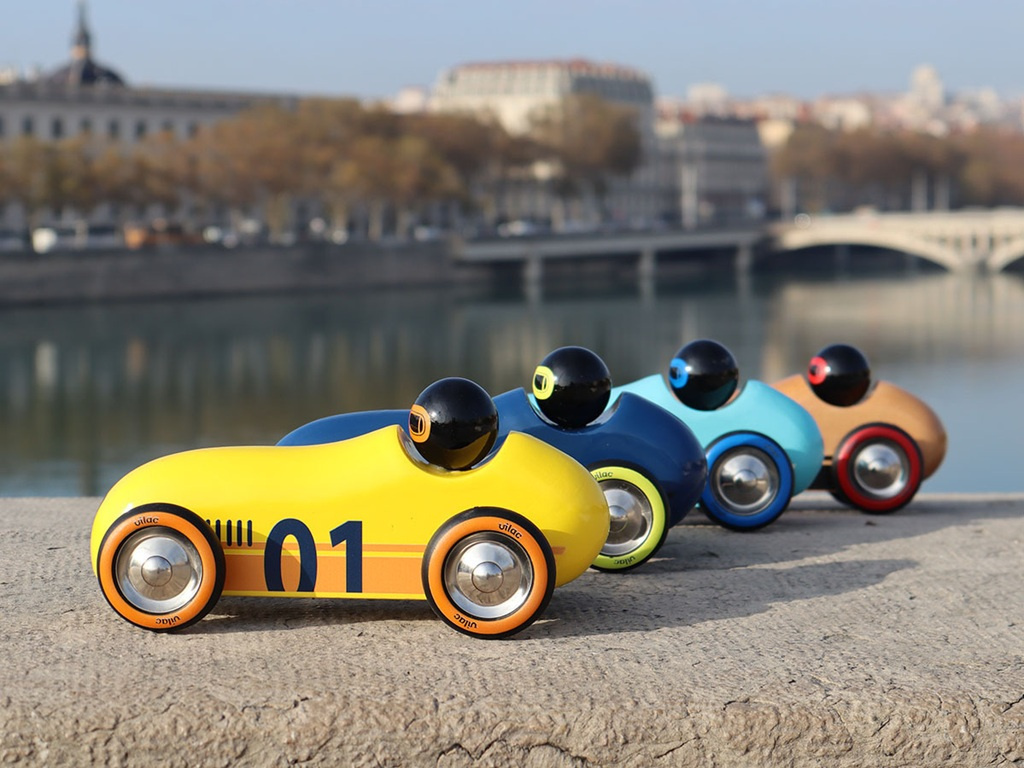Neobyčejné autíčko oblých aerodynamických tvarů v jedinečném designu, které je určeno ke hraní i jako atraktivní doplněk interiéru či sběratelský kousek. Při hře s autíčkem využívá dítě mnoho dovedností: jemnou motoriku, obratnost, představivost, kreativitu. Může reprodukovat zvuky motoru nebo sirén, parkovat do garáže, projíždět se. Hraním s ostatními dětmi nebo členy rodiny se učí sdílet, spolupracovat a napodobovat, čímž rozvíjí důležité sociální dovednosti. Autíčko je vyrobeno z masivního bukového dřeva, lakováno ručně bezpečnými barvami tradičním procesem ponoření do lázně s barvou. Vyrobeno ve Francii, dodáváno v potištěné krabičce.